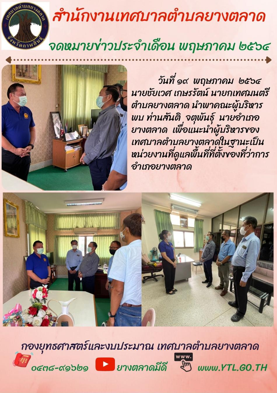 นายชัยเวศ เกษรรัตน์ นายกเทศมนตรีตำบลยางตลาด นำพาคณะผู้บริหารพบ ท่านสันติ จตุพันธุ์ นายอำเภอยางตลาด [19 พฤษภาคม 2564]
