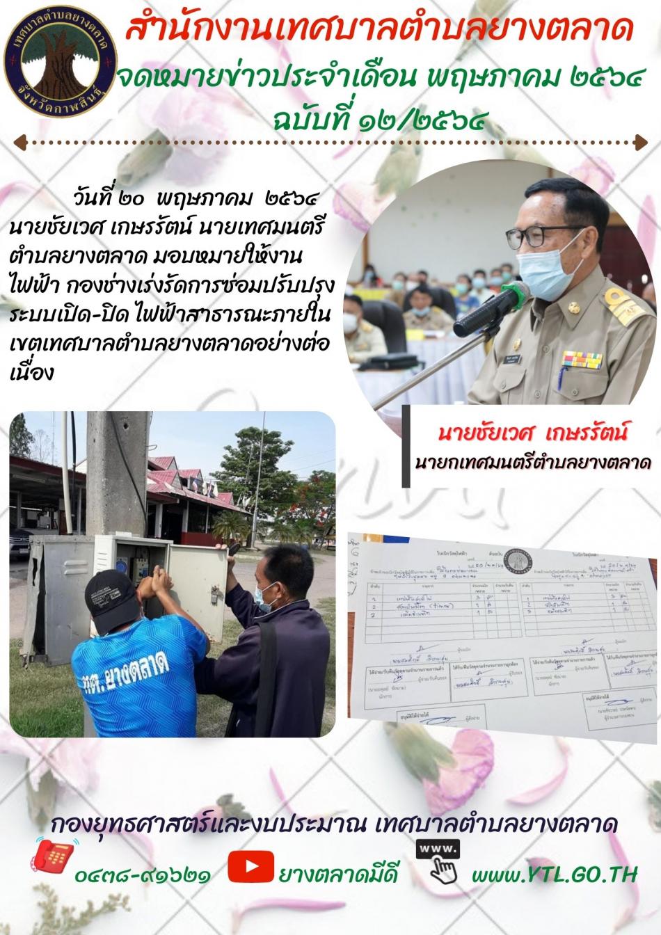 งานไฟฟ้า กองช่างเร่งรัดการซ่อมปรับปรับระเปิด - ปิด ไฟฟ้าสาธารณะภายในเขตเทศบาลตำบลยางตลาดอย่างต่อเนื่่อง [20 พฤษภาคม 2564]