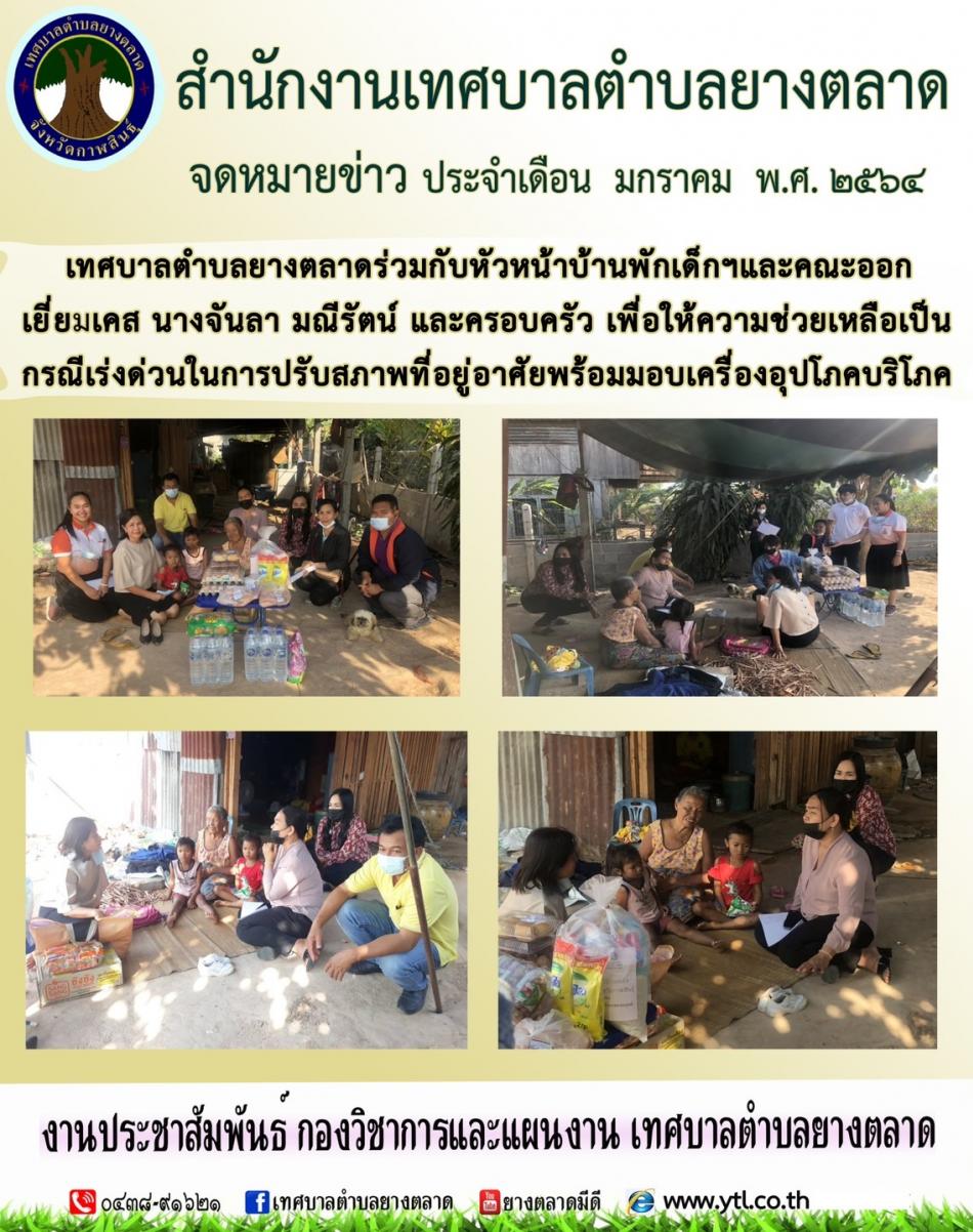 เทศบาลตำบลยางตลาดร่วมกับหัวหน้าบ้านพักเด็กฯและคณะออกเยี่ยมเคส นางจันลา มรีีัตน์ และครอบครัวเพื่อให้ความช่วยเหลือเป็นกรณีเร่งเด่วนในการปรับสภาพที่อยู่อาศัยพร้อมมอบเครื่องอุปโภค [12 มกราคม 2564]