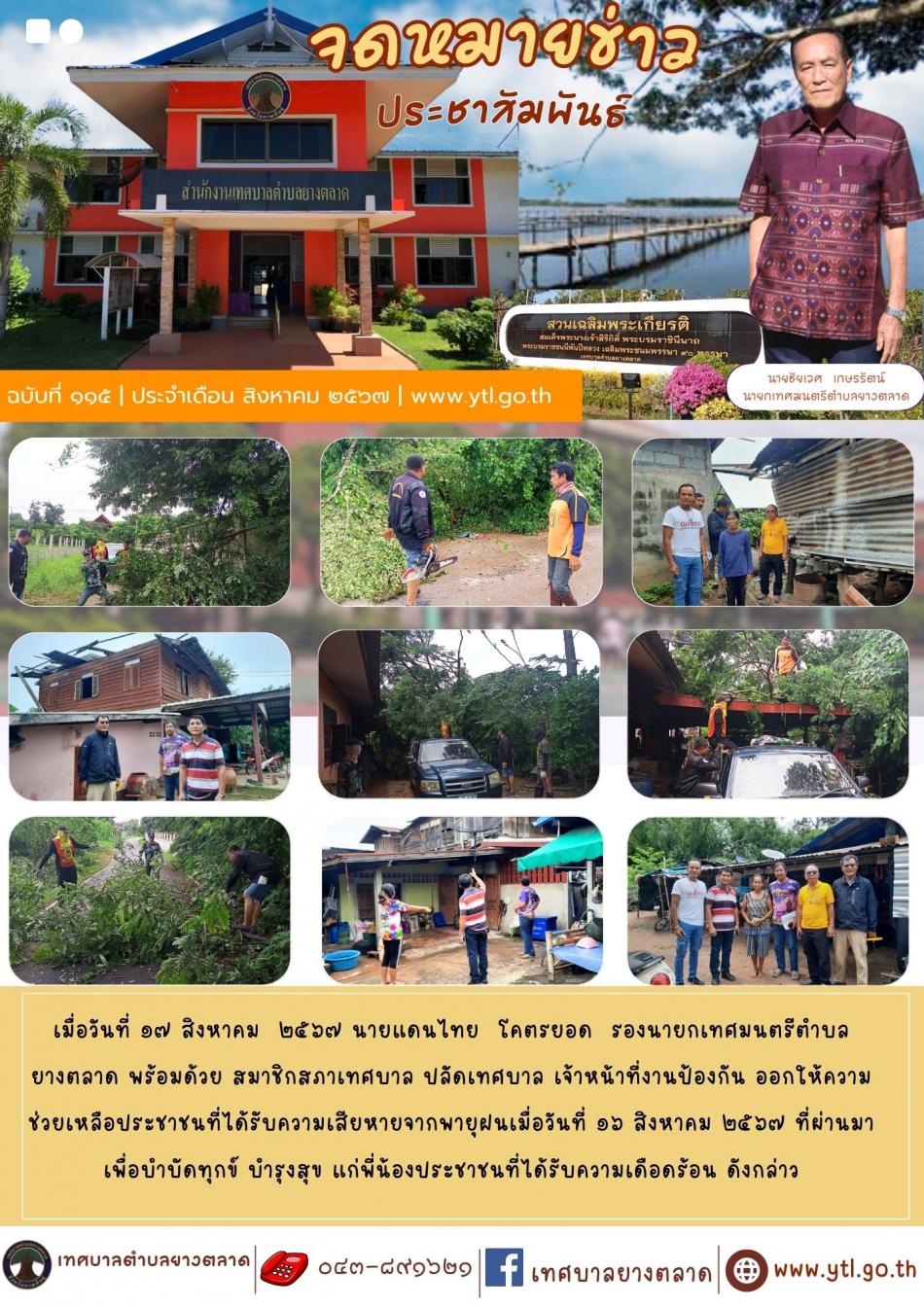 เมื่อวันที่ ๑๗ สิงหาคม ๒๕๖๗ นายแดนไทย โคตรยอด รองนายกเทศมนตรีตำบลยางตลาด พร้อมด้วย สมาชิกสภาเทศบาล ปลัดเทศบาล เจ้าหน้าที่งานป้องกัน ออกให้ความช่วยเหลือประชาชนที่ได้รับความเสียหายจากพายุฝนเมื่อวันที่ ๑๖... [17 สิงหาคม 2567]