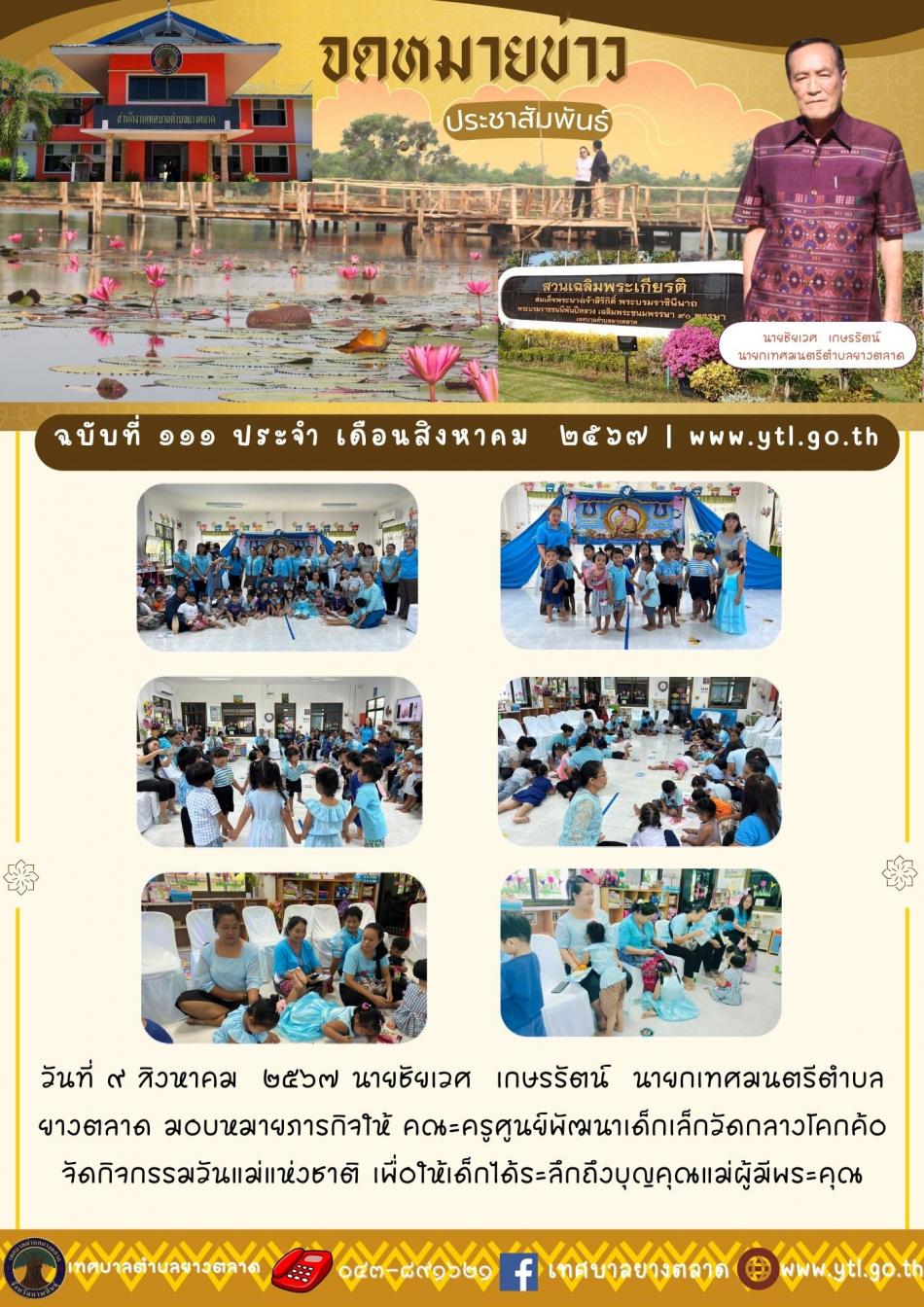 วันที่ ๙ สิงหาคม ๒๕๖๗ นายชัยเวศ เกษรรัตน์ นายกเทศมนตรีตำบลยางตลาด มอบหมายภารกิจให้ คณะครูศูนย์พัฒนาเด็กเล็กวัดกลางโคกค้อจัดกิจกรรมวันแม่แห่งชาติ เพื่อให้เด็กได้ระลึกถึงบุญคุณแม่ผู้มีพระคุณ [9 สิงหาคม 2567]
