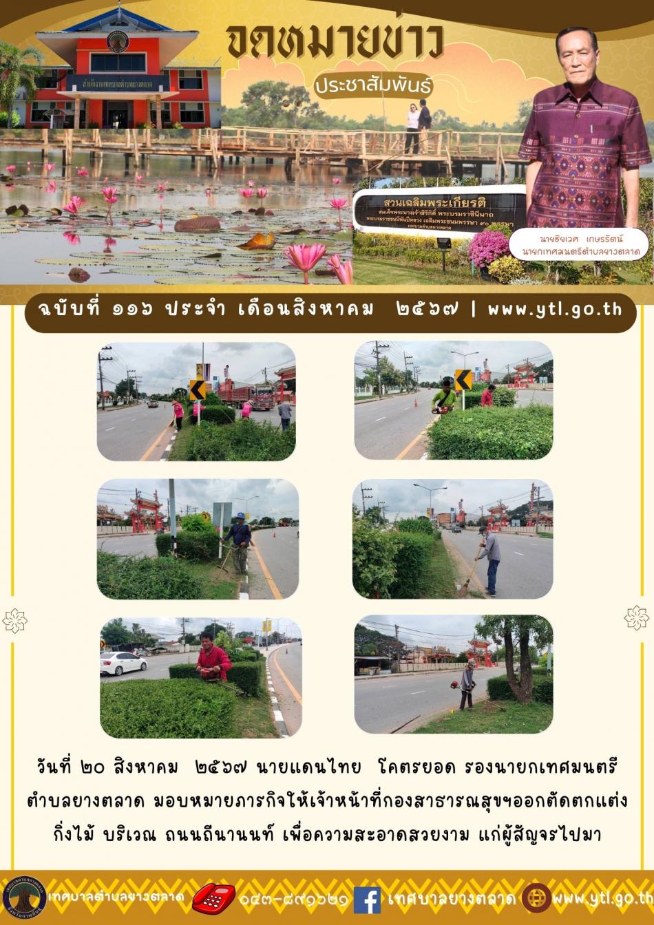 วันที่ ๒๐ สิงหาคม ๒๕๖๗ นายแดนไทย โคตรยอด รองนายกเทศมนตรีตำบลยางตลาด มอบหมายภารกิจให้เจ้าหน้าที่กองสาธารณสุขฯออกตัดตกแต่งกิ่งไม้ บริเวณ ถนนถีนานนท์ เพื่อความสะอาดสวยงาม แก่ผู้สัญจรไปมา [20 สิงหาคม 2567]