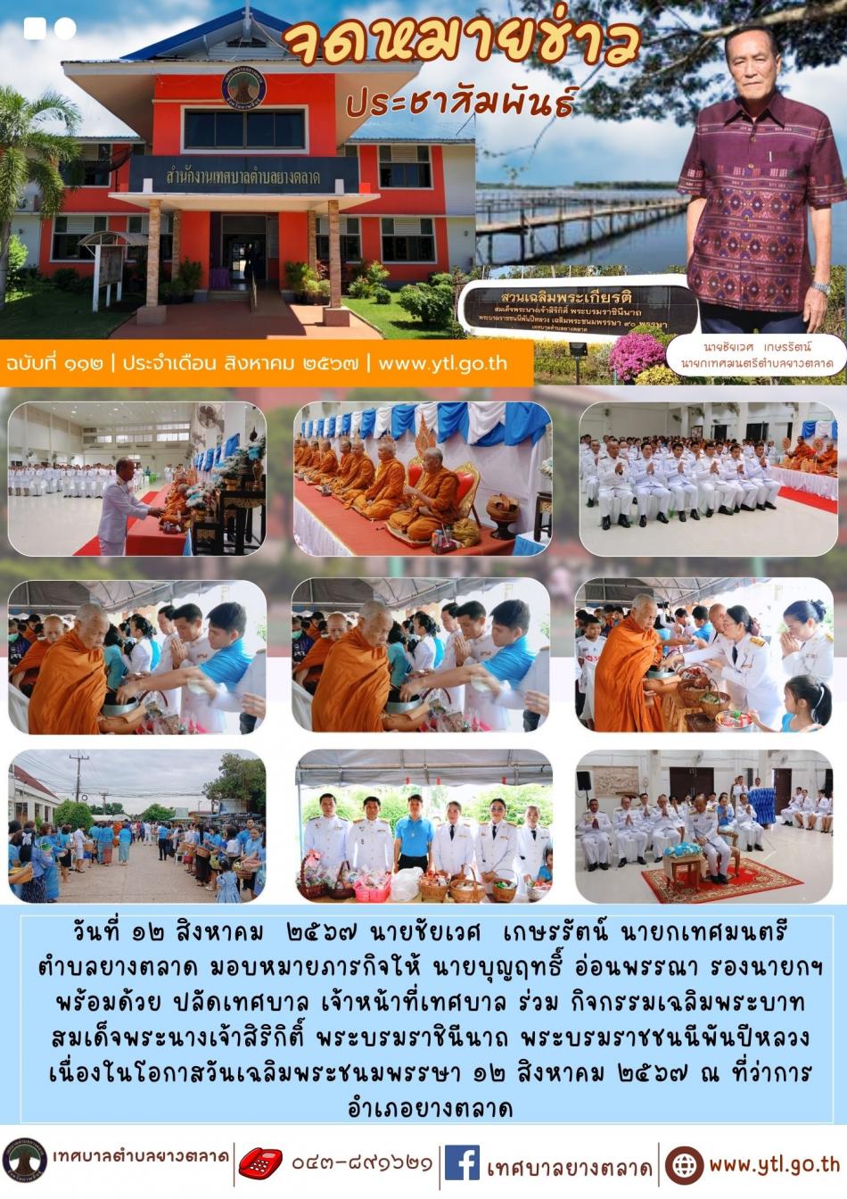 วันที่ ๑๒ สิงหาคม ๒๕๖๗ นายชัยเวศ เกษรรัตน์ นายกเทศมนตรี ตำบลยางตลาด มอบหมายภารกิจให้ นายบุญฤทธิ์ อ่อนพรรณา รองนายกฯ พร้อมด้วย ปลัดเทศบาล เจ้าหน้าที่เทศบาล ร่วม กิจกรรมเฉลิมพระบาทสมเด็จพระนางเจ้าสิริกิติ์... [12 สิงหาคม 2567]