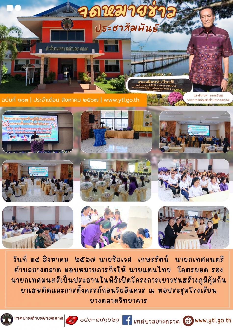 วันที่ ๑๔ สิงหาคม ๒๕๖๗ นายชัยเวศ เกษรรัตน์ นายกเทศมนตรีตำบลยางตลาด มอบหมายภารกิจให้ นายแดนไทย โคตรยอด รองนายกเทศมนตรีเป็นประธานในพิธีเปิดโครงการเยาวชนสร้างภูมิคุ้มกันยาเสพติดและการตั้งครรภ์ก่อนวัยอันควร ณ... [14 สิงหาคม 2567]