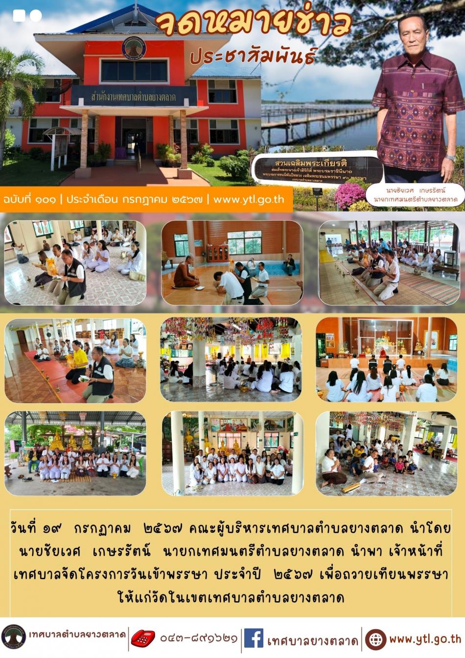 วันที่ ๑๙ กรกฏาคม ๒๕๖๗ คณะผู้บริหารเทศบาลตำบลยางตลาด นำโดย นายชัยเวศ เกษรรัตน์ นายกเทศมนตรีตำบลยางตลาด นำพา เจ้าหน้าที่เทศบาลจัดโครงการวันเข้าพรรษา ประจำปี ๒๕๖๗... [19 กรกฎาคม 2567]