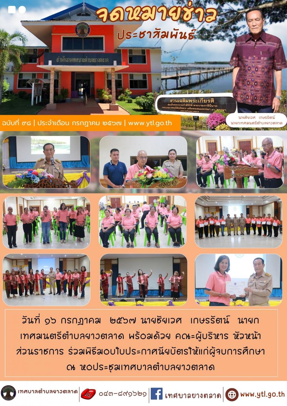 วันที่ ๑๖ กรกฎาคม ๒๕๖๗ นายชัยเวศ เกษรรัตน์ นายกเทศมนตรีตำบลยางตลาด พร้อมด้วย คณะผู้บริหาร หัวหน้าส่วนราชการ ร่วมพิธีมอบใบประกาศนียบัตรให้แก่ผู้จบการศึกษา ณ หอประชุมเทศบาลตำบลยางตลาด [16 กรกฎาคม 2567]