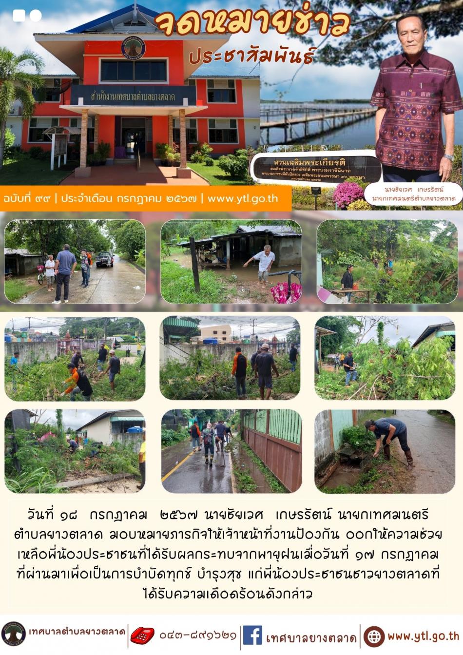 วันที่ ๑๘ กรกฎาคม ๒๕๖๗ นายชัยเวศ เกษรรัตน์ นายกเทศมนตรีตำบลยางตลาด มอบหมายภารกิจให้เจ้าหน้าที่งานป้องกัน ออกให้้ความช่วยเหลือพี่น้องประชาชนที่ได้รับผลกระทบจากพายุฝนเมื่อวันที่ ๑๗ กรกฏาคม... [18 กรกฎาคม 2567]