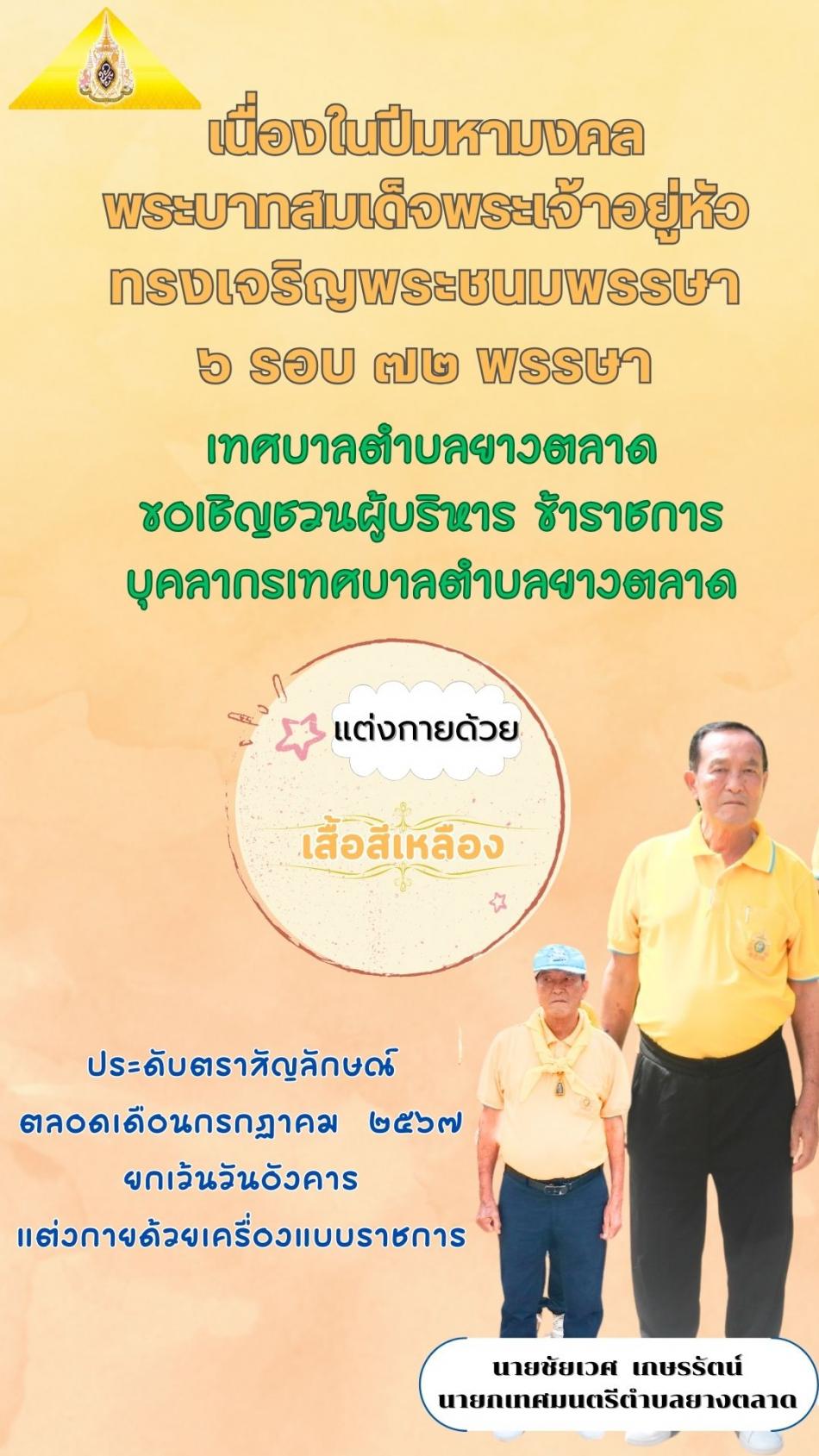 เทศบาลตำบลยางตลาดขอเชิญร่วมแต่งกายด้วยเสื้อเหลือง [5 กรกฎาคม 2567]