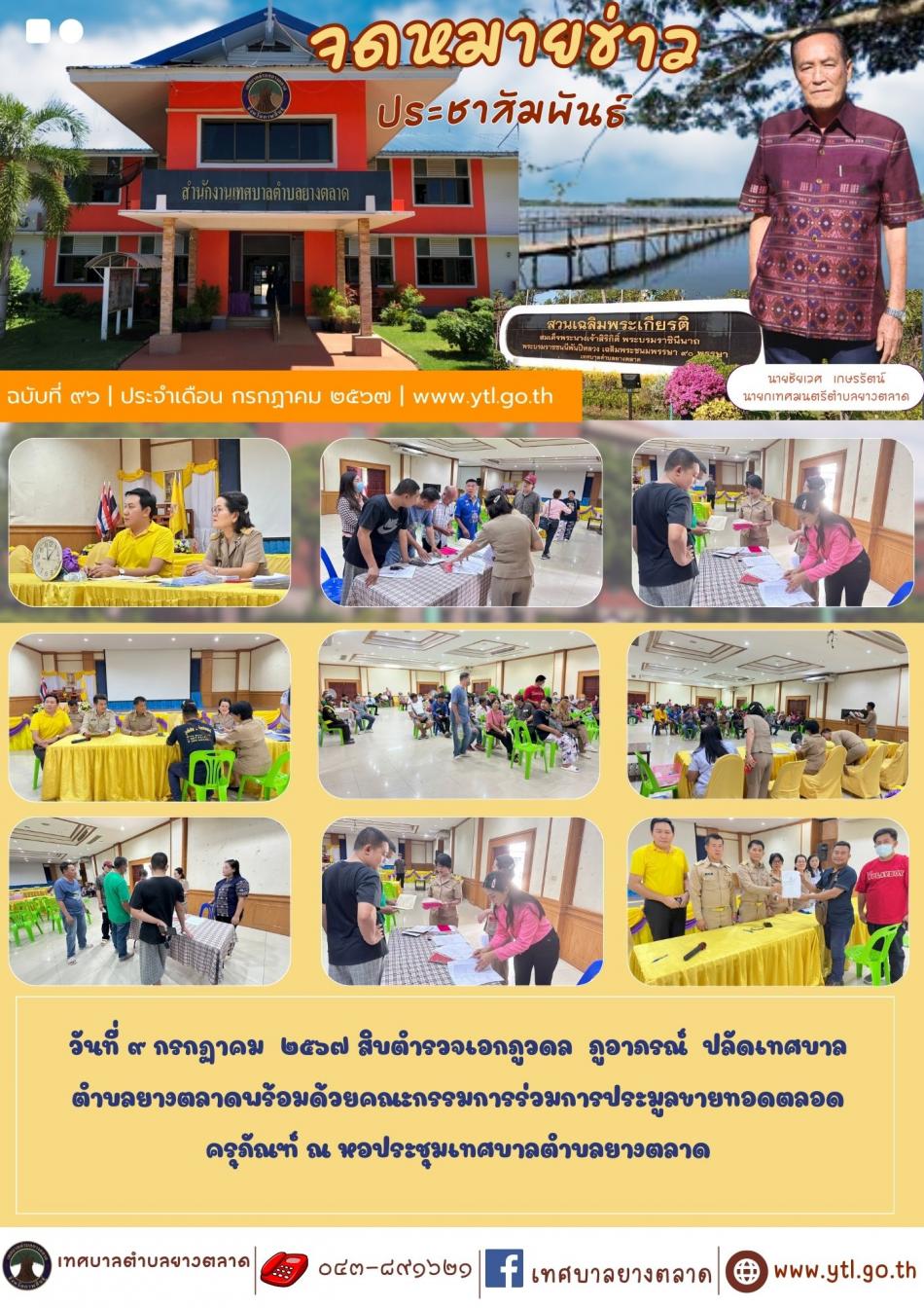 วันที่ ๙ กรกฏาคม ๒๕๖๗ สิบตำรวจเอกภูวดล ภูอาภรณ์ ปลัดเทศบาลตำบลยางตลาดพร้อมด้วยคณะกรรมการร่วมการประมูลขายทอดตลอดครุภัณฑ์ ณ หอประชุมเทศบาลตำบลยางตลาด [9 กรกฎาคม 2567]