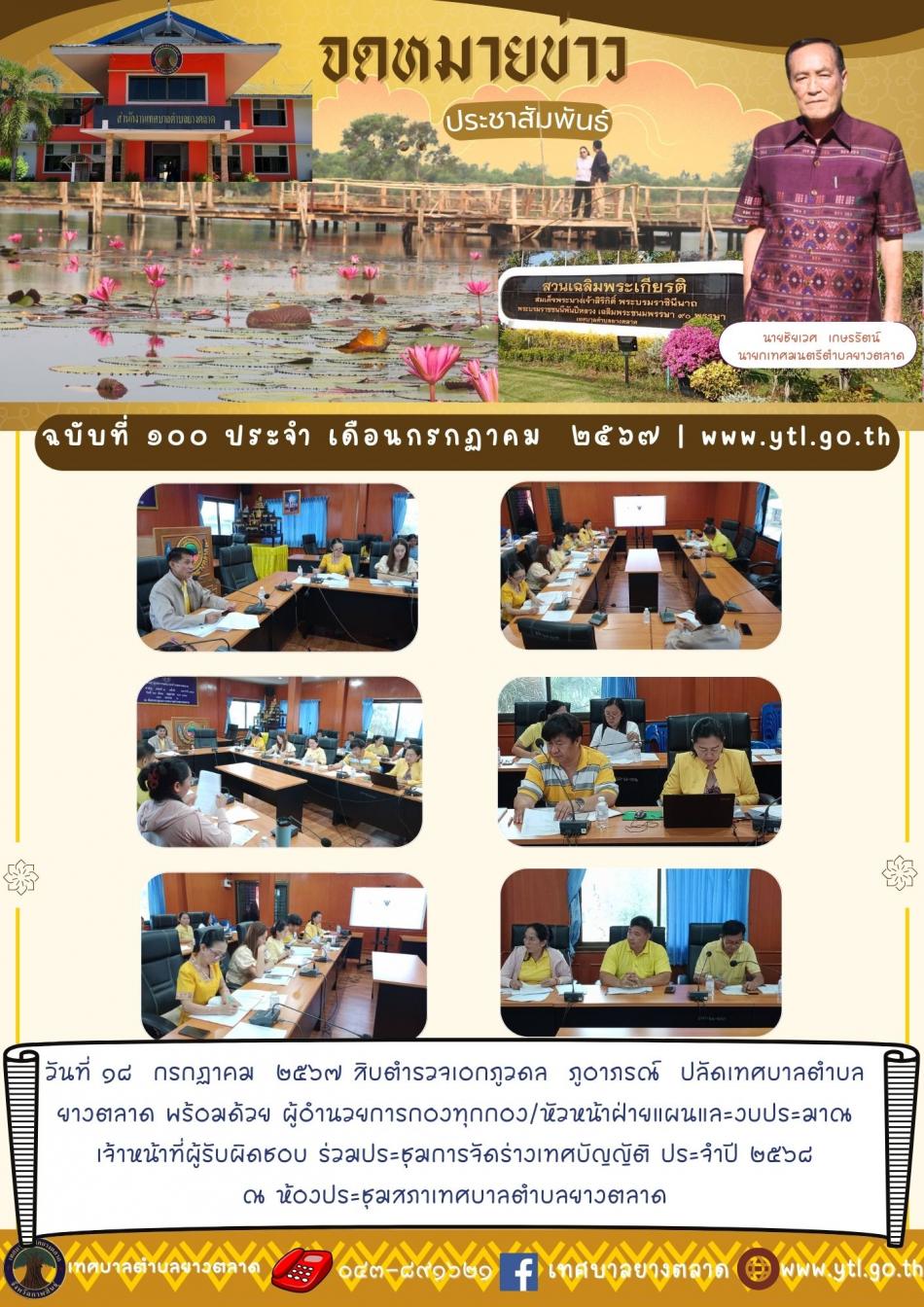 วันที่ ๑๘ กรกฏาคม ๒๕๖๗ สิบตำรวจเอกภูวดล ภูอาภรณ์ ปลัดเทศบาลตำบลยางตลาด พร้อมด้วย ผู้อำนวยการกองทุกกอง/หัวหน้าฝ่ายแผนและงบประมาณ เจ้าหน้าที่ผู้รับผิดชอบ ร่วมประชุมการจัดร่างเทศบัญญัติ ประจำปี ๒๕๖๘ ณ... [18 กรกฎาคม 2567]