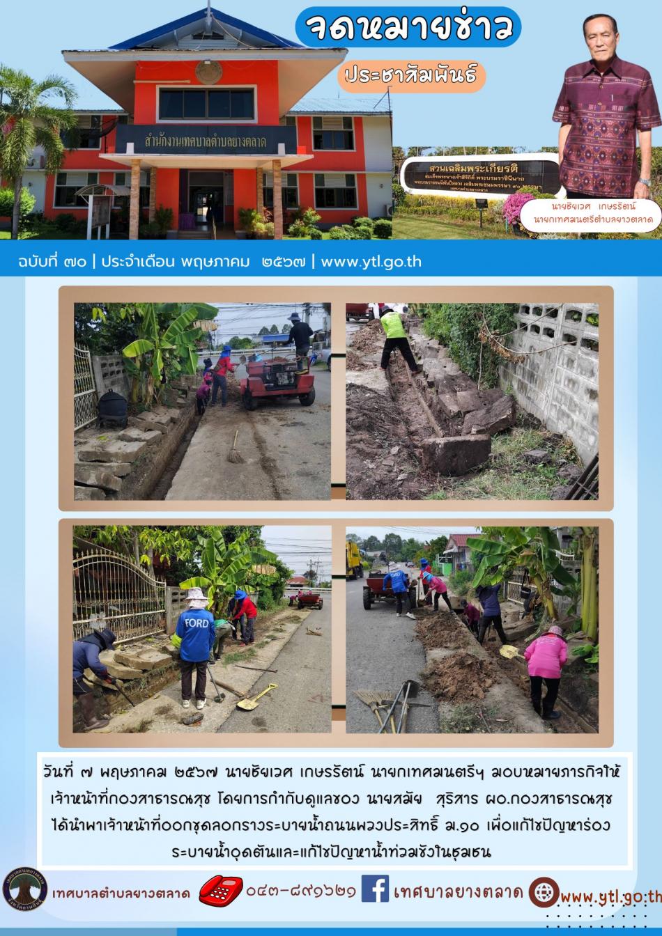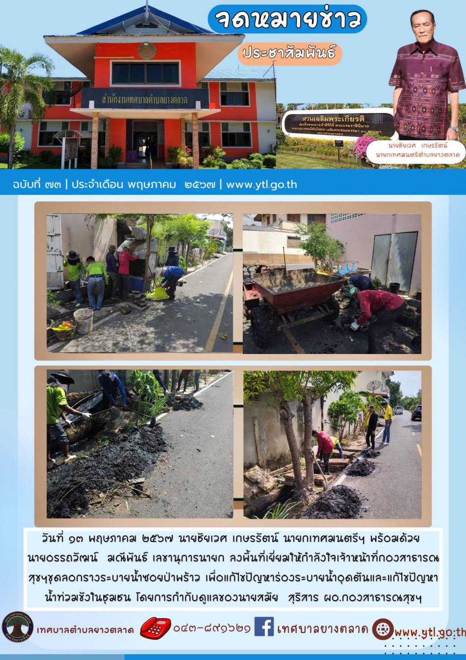 วันที่ ๗ พฤษภาคม ๒๕๖๗ นายชัยเวศ เกษรรัตน์ นายกเทศมนตรีฯ มอบหมายภารกิจให้ เจ้าหน้าที่กองสาธารณสุข โดยการกำกับดูแลของ นายสมัย สุริสาร ผอ.กองสาธารณสุข ได้นำพาเจ้าหน้าที่ออกขุดลอกรางระบายน้ำถนนพวงประสิทธิ์ ม.๑๐... [7 พฤษภาคม 2567]