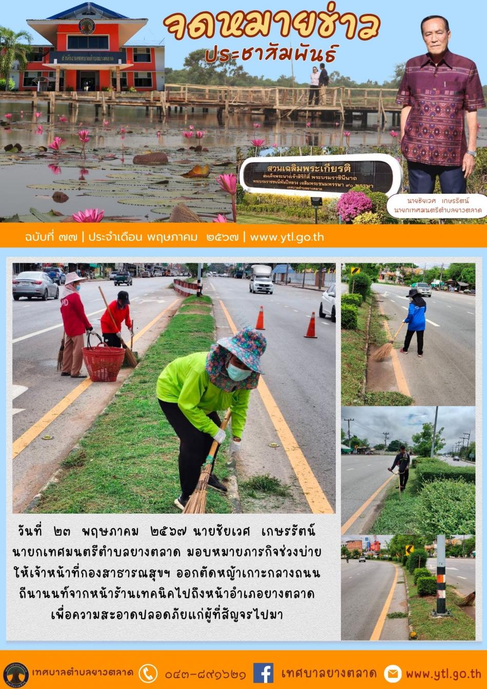 วันที่ ๒๓ พฤษภาคม ๒๕๖๗ นายชัยเวศ เกษรรัตน์ นายกเทศมนตรีตำบลยางตลาด มอบหมายภารกิจช่วงบ่ายให้เจ้าหน้าที่กองสาธารณสุขฯ ออกตัดหญ้าเกาะกลางถนนถีนานนท์จากหน้าร้านเทคนิคไปถึงหน้าอำเภอยางตลาด... [23 พฤษภาคม 2567]