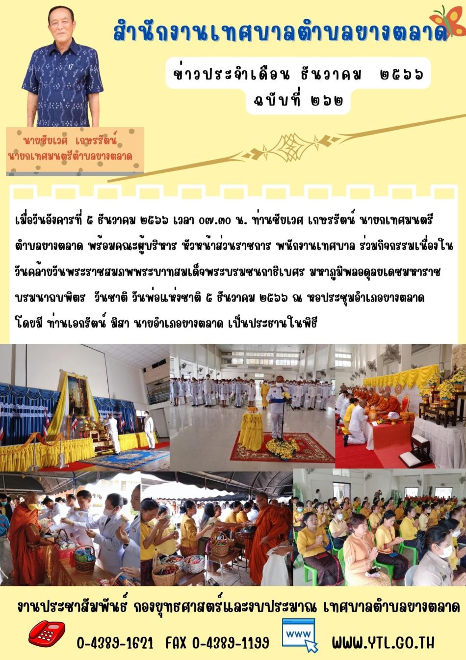 เมื่อวันอังคารที่ ๕ ธันวาคม ๒๕๖๖ เวลา ๐๗.๓๐ น. ท่านชัยเวศ เกษรรัตน์ นายกเทศมนตรีตำบลยางตลาด พร้อมคณะผู้บริหาร หัวหน้าส่วนราชการ พนักงานเทศบาล... [6 ธันวาคม 2566]