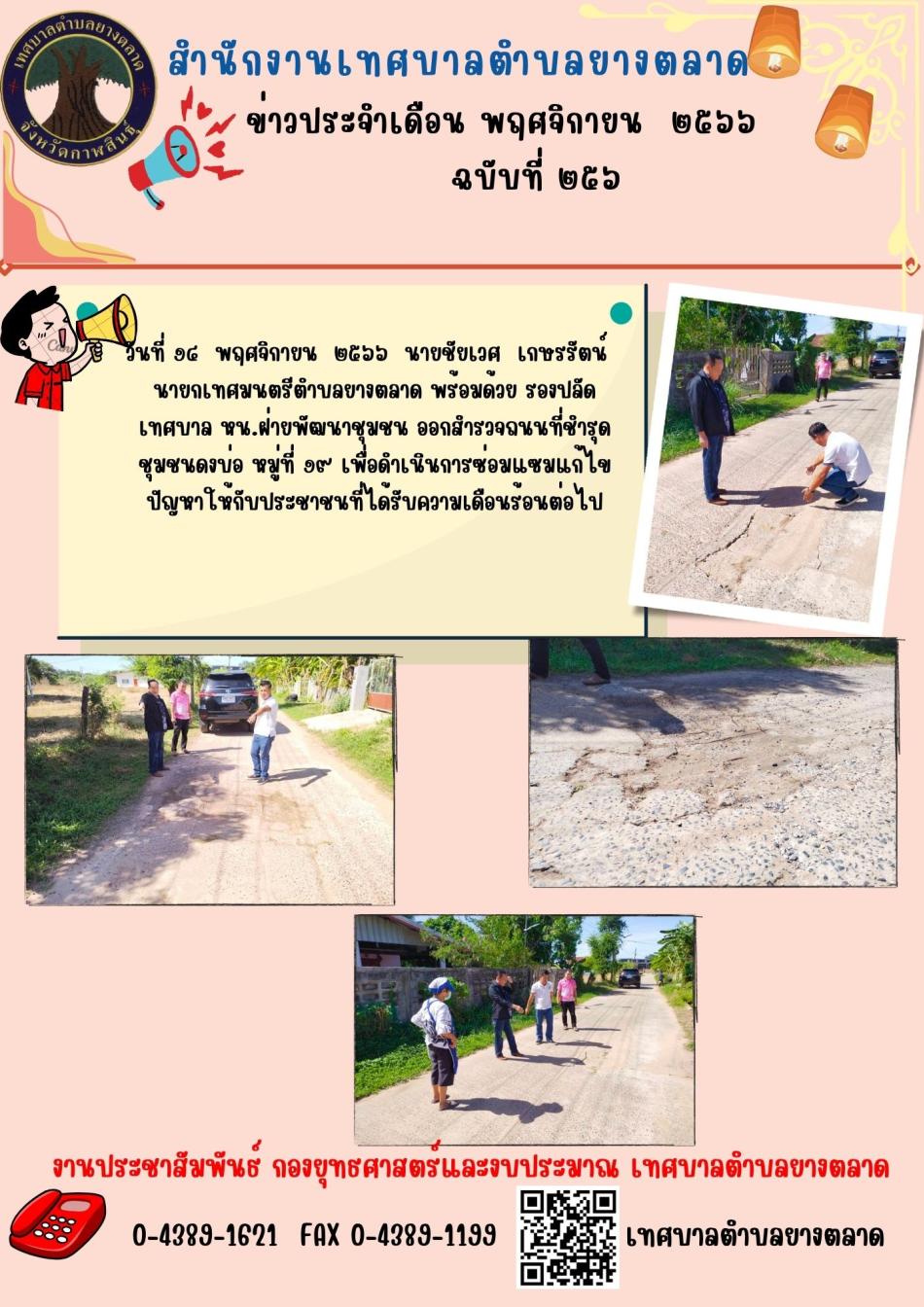 วันที่ ๑๔ พฤศจิกายน ๒๕๖๖ นายชัยเวศ เกษรรัตน์ นายกเทศมนตรีตำบลยางตลาด พร้อมด้วย รองปลัดเทศบาล หน.ฝ่ายพัฒนาชุมชน ออกสำรวจถนนที่ชำรุด ชุมชนดงบ่อ หมู่ที่ ๑๙... [14 พฤศจิกายน 2566]