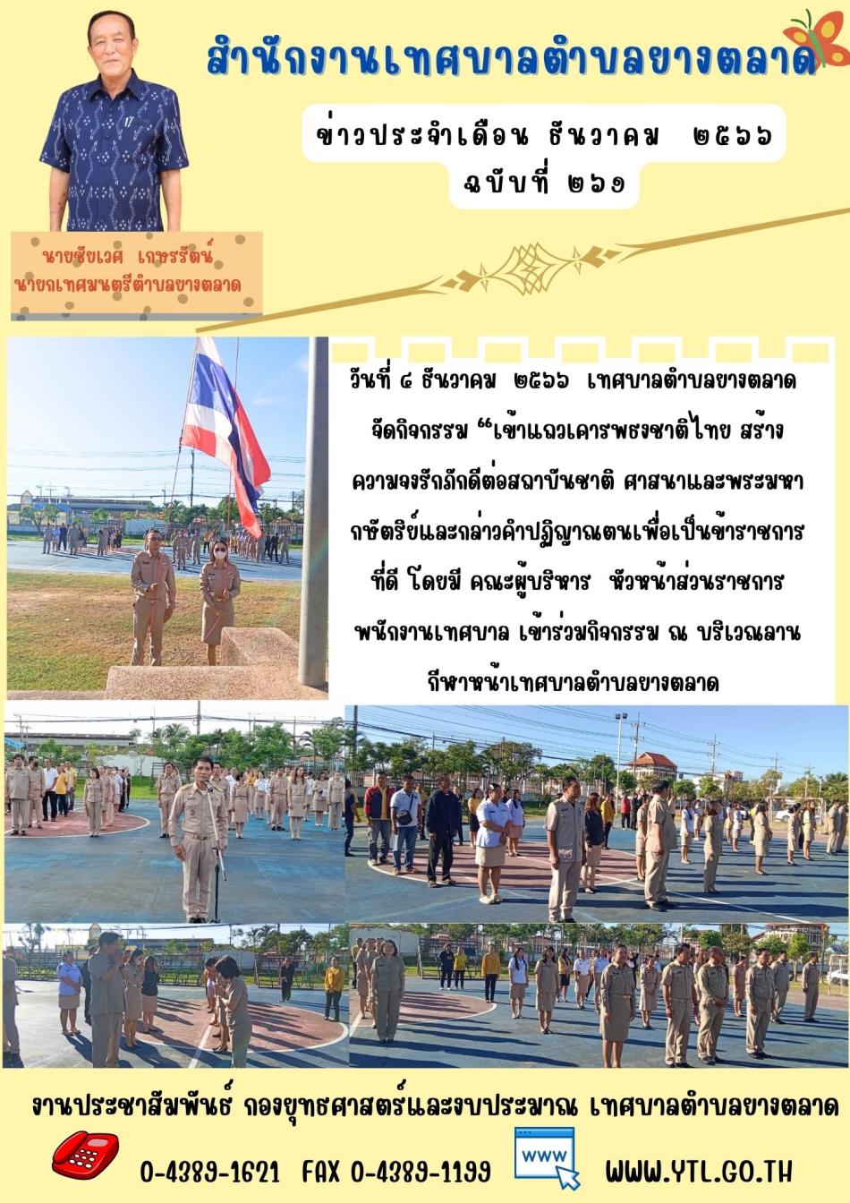 วันที่ ๔ ธันวาคม ๒๕๖๖ เทศบาลตำบลยางตลาด จัดกิจกรรม “เข้าแถวเคารพธงชาติไทย สร้างความจงรักภักดีต่อสถาบันชาติ ศาสนาและพระมหากษัตริย์และกล่าวคำปฏิญาณตนเพื่อเป็นข้าราชการที่ดี โดยมี คณะผู้บริหาร ... [4 ธันวาคม 2566]