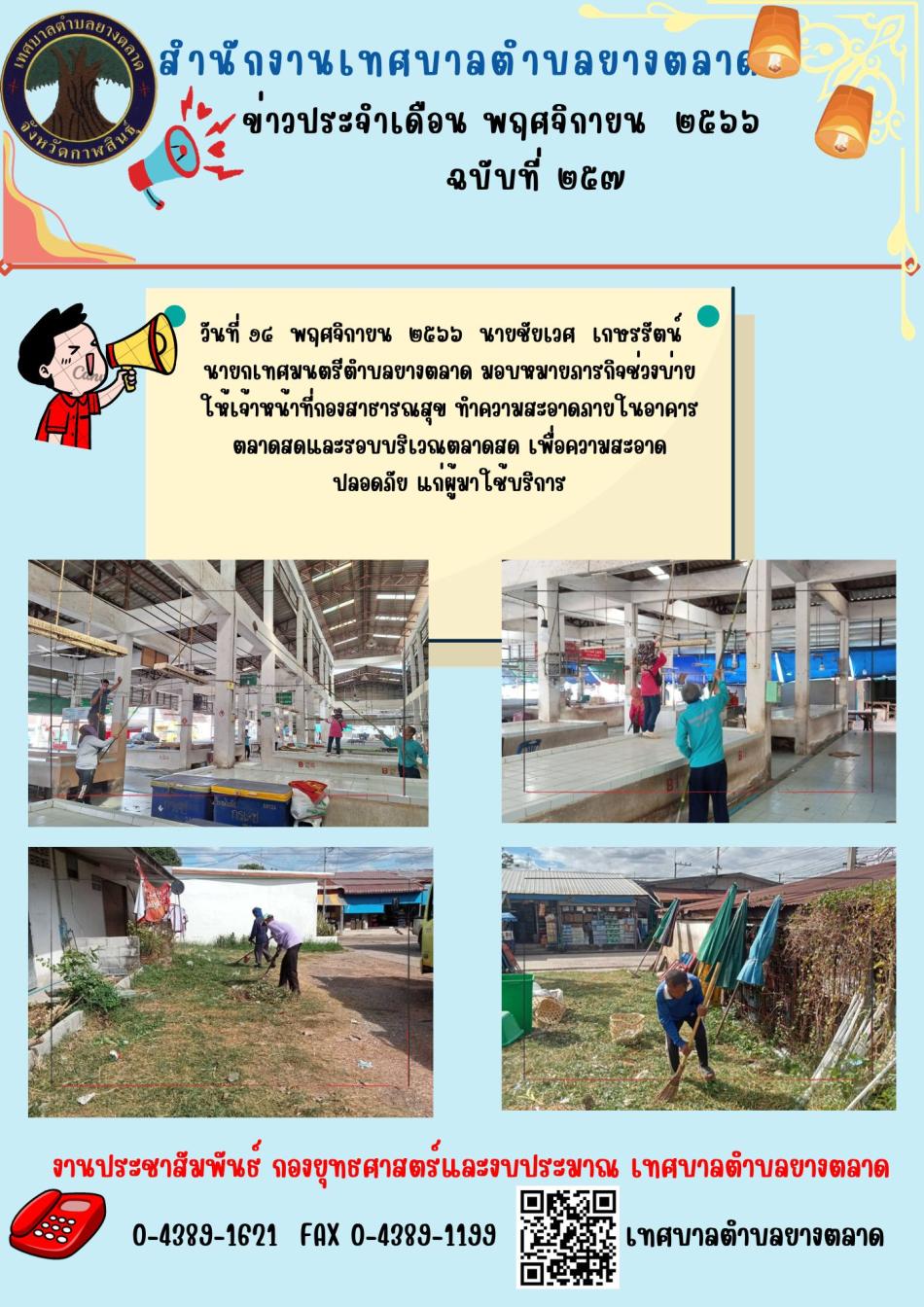 วันที่ ๑๔ พฤศจิกายน ๒๕๖๖ นายชัยเวศ เกษรรัตน์ นายกเทศมนตรีตำบลยางตลาด มอบหมายภารกิจช่วงบ่ายให้เจ้าหน้าที่กองสาธารณสุข ทำความสะอาดภายในอาคารตลาดสดและรอบบริเวณตลาดสด เพื่อความสะอาดปลอดภัย แก่ผู้มาใช้บริการ [14 พฤศจิกายน 2566]