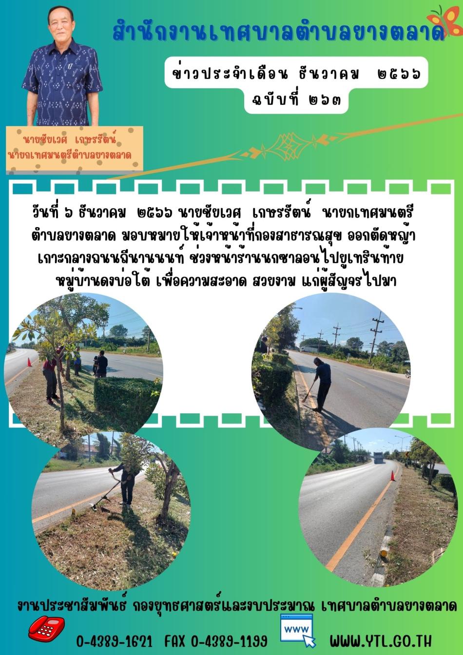 วันที่ ๖ ธันวาคม ๒๕๖๖ นายชัยเวศ เกษรรัตน์ นายกเทศมนตรีตำบลยางตลาด มอบหมายให้เจ้าหน้าที่กองสาธารณสุข ออกตัดหญ้าเกาะกลางถนนถีนานนนท์ ช่วงหน้าร้านนกซาลอนไปยูเทรินท้าย หมู่บ้านดงบ่อใต้ เพื่อความสะอาด สวยงาม... [6 ธันวาคม 2566]