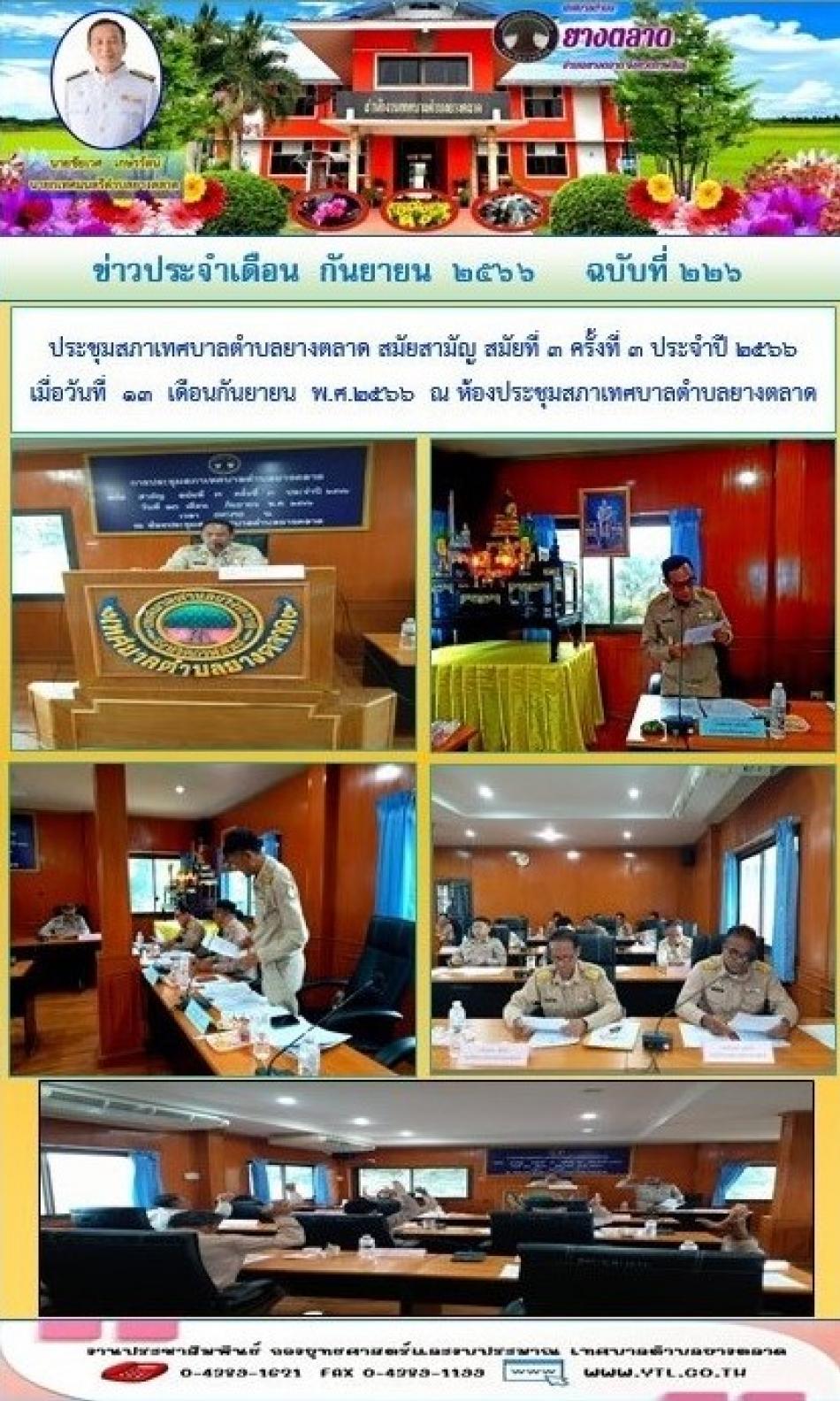ประชุมสภาเทศบาลตำบลยางตลาด สมัยสามัญ สมัยที่ ๓ ครั้งที่ ๓ ประจำปี ๒๕๖๖ เมื่อวันที่ ๑๓ เดือนกันยายน พ.ศ.๒๕๖๖ ณ ห้องประชุมสภาเทศบาลตำบลยางตลาด [13 กันยายน 2566]