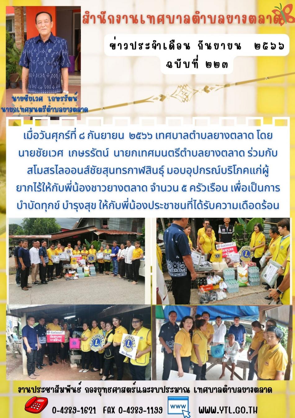 เมื่อวันศุกร์ที่ ๘ กันยายน ๒๕๖๖ เทศบาลตำบลยางตลาด โดยนายชัยเวศ เกษรรัตน์ นายกเทศมนตรีตำบลยางตลาด ร่วมกับ สโมสรไลออนส์ชัยสุนทรกาฬสินธุ์ มอบอุปกรณ์บริโภคแก่ผู้ยากไร้ให้กับพี่น้องชาวยางตลาด จำนวน ๕ ครัวเรือน... [11 กันยายน 2566]