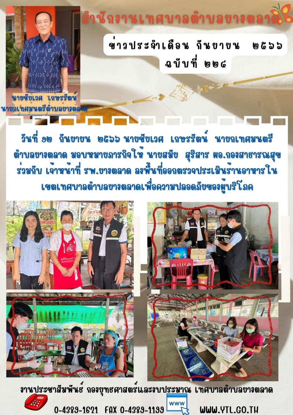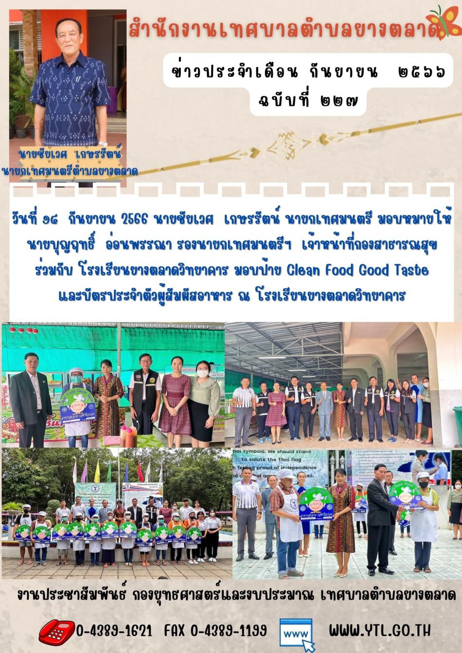 ันที่ 14 กันยายน 2566 นายชัยเวศ เกษรรัตน์ นายกเทศมนตรี มอบหมายให้นายบุญฤทธิ์ อ่อนพรรณา รองนายกเทศมนตรี เจ้าหน้าที่กองสาธารณสุขร่วมกับโรงเรียนยางตลาดวิทยาคารมอบป้าย Clean Food Good Taste และบัตรประจำตัวผู้สัมผัสอาหาร ณ... [14 กันยายน 2566]