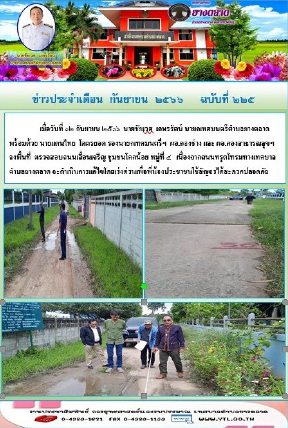 เมื่อวันที่ ๑๒ กันยายน ๒๕๖๖ นายชัยเวศ เกษรรัตน์ นายกเทศมนตรีตำบลยางตลาด พร้อมด้วย นายแดนไทย โคตรยอด รองนายกเทศมนตรีฯ ผอ.กองช่าง ผอ.กองสาธารณสุขฯ ลงพื้นที่ตรวจสอบถนนเลื่อนเจริญ ชุมชนโคกน้อย หมู่ที่ ๔... [13 กันยายน 2566]