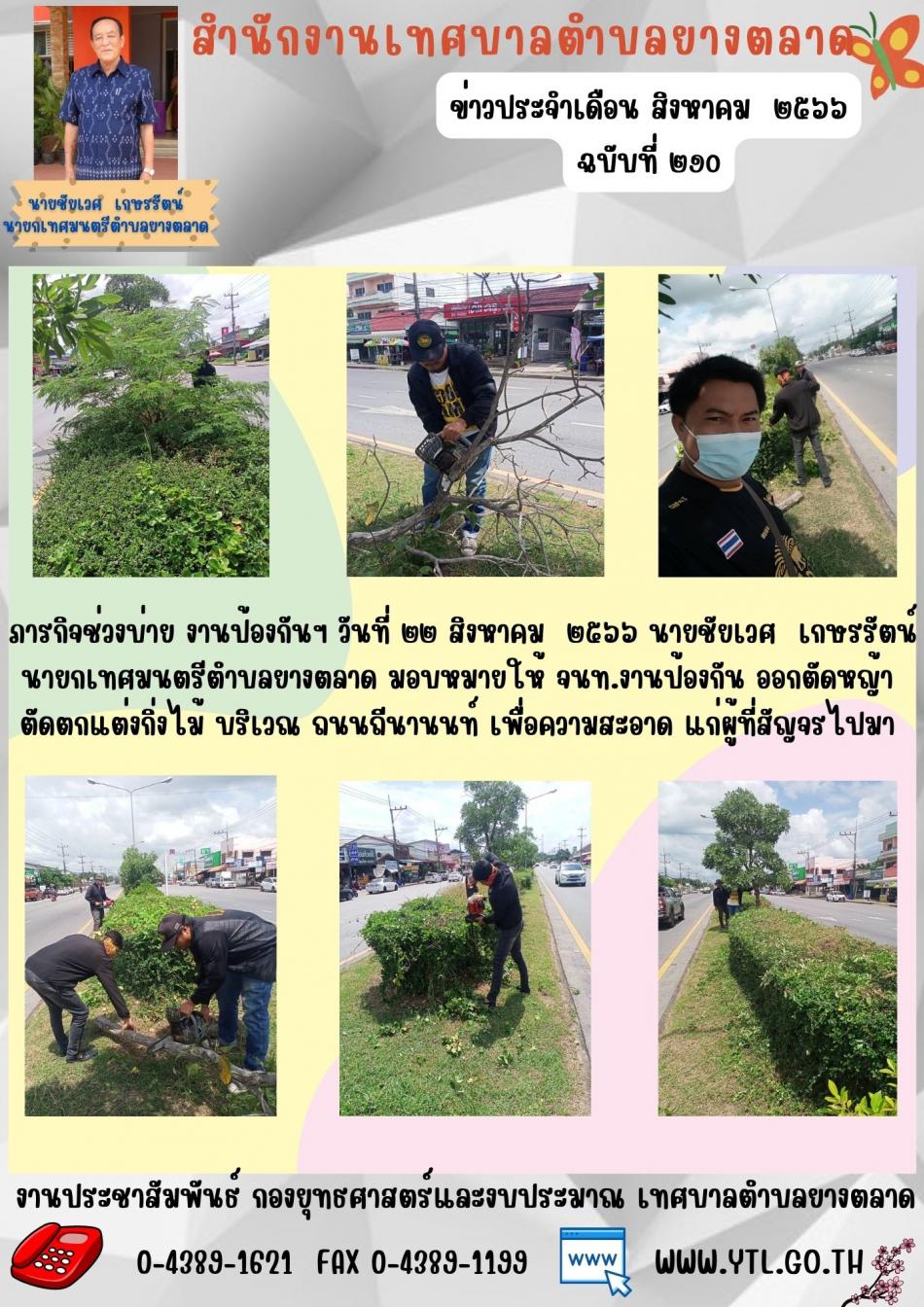 ภารกิจช่วงบ่าย งานป้องกันฯ วันที่ ๒๒ สิงหาคม ๒๕๖๖ นายชัยเวศ เกษรรัตน์ นายกเทศมนตรีตำบลยางตลาด มอบหมายให้ จนท.งานป้องกัน ออกตัดหญ้า ตัดตกแต่งกิ่งไม้ บริเวณ ถนนถีนานนท์ เพื่อความสะอาด แก่ผู้ที่สัญจรไปมา [22 สิงหาคม 2566]