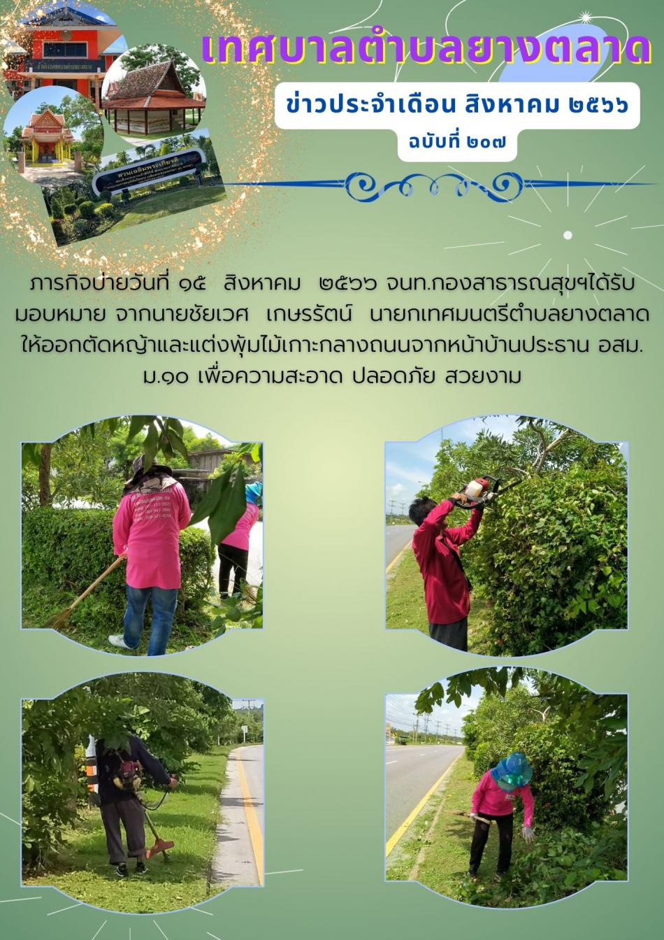 ภารกิจบ่ายวันที่ ๑๕ สิงหาคม ๒๕๖๖ จนท.กองสาธารณสุขฯได้รับมอบหมาย จากนายชัยเวศ เกษรรัตน์ นายกเทศมนตรีตำบลยางตลาด ให้ออกตัดหญ้าและแต่งพุ้มไม้เกาะกลางถนนจากหน้าบ้านประธาน อสม. ม.๑๐ เพื่อความสะอาด ปลอดภัย สวยงาม [15 สิงหาคม 2566]
