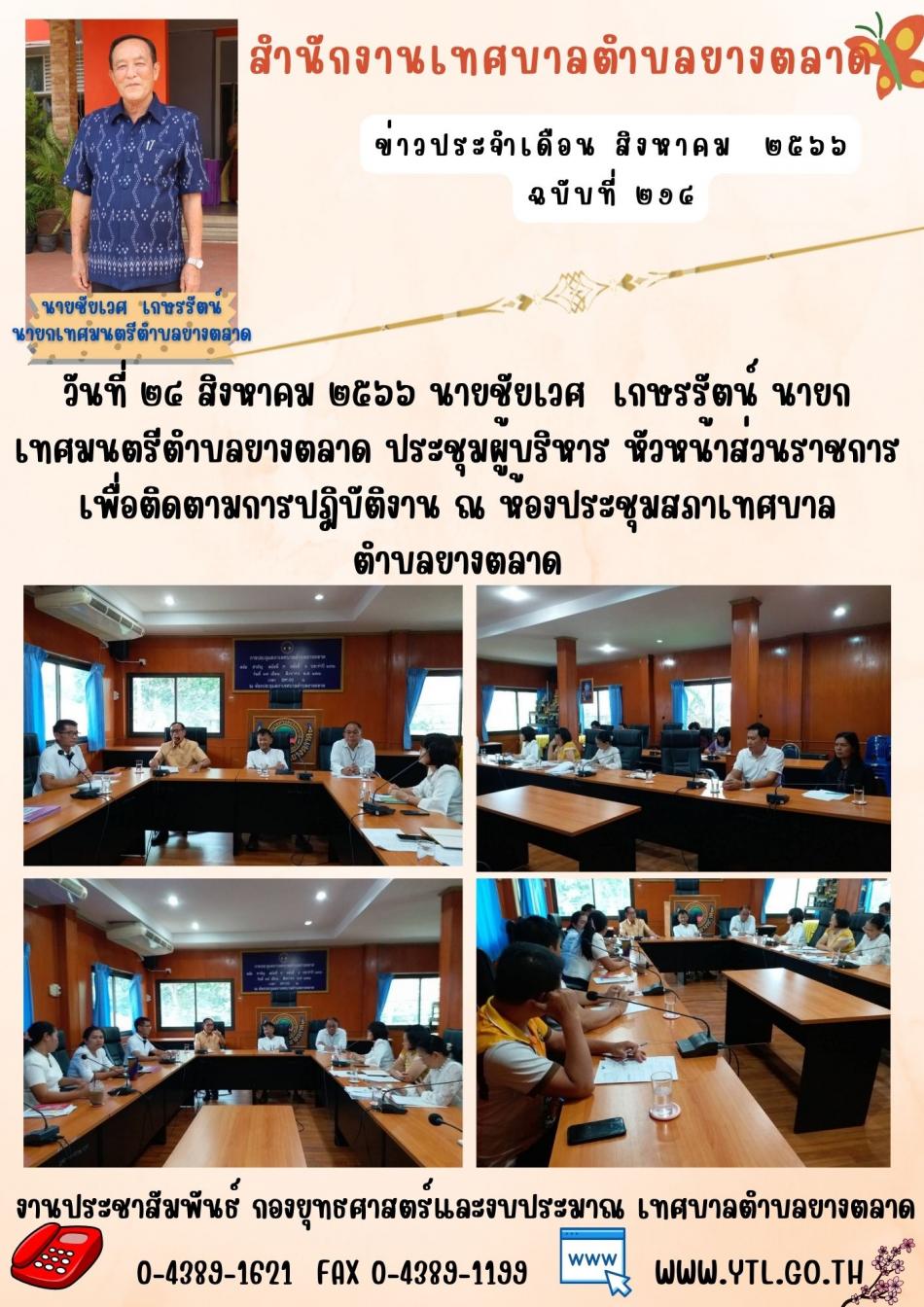 วันที่ ๒๔ สิงหาคม ๒๕๖๖ นายชัยเวศ เกษรรัตน์ นายกเทศมนตรีตำบลยางตลาด ประชุมผู้บริหาร หัวหน้าส่วนราชการ เพื่อติดตามการปฎิบัติงาน ณ ห้องประชุมสภาเทศบาล ตำบลยางตลาด [24 สิงหาคม 2566]
