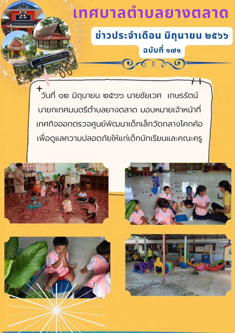 วันที่ ๑๒ มิถุนายน ๒๕๖๖ นายชัยเวศ เกษรรัตน์ นายกเทศมนตรีตำบลยางตลาด มอบหมายเจ้าหน้าที่เทศกิจออกตรวจศูนย์พัฒนาเด็กเล็กวัดกลางโคกค้อ เพื่อดูแลความปลอดภัยให้แก่เด็กนักเรียนและคณะครู [12 มิถุนายน 2566]