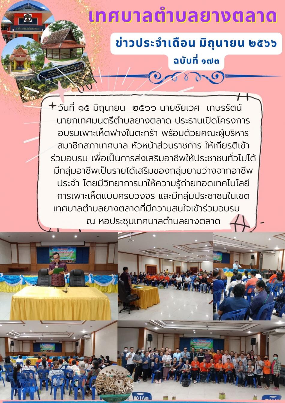 วันที่ ๑๕ มิถุนายน ๒๕๖๖ นายชัยเวศ เกษรรัตน์ นายกเทศมนตรีตำบลยางตลาด ประธานเปิดโครงการอบรมเพาะเห็ดฟางในตะกร้า พร้อมด้วยคณะผู้บริหาร สมาชิกสภาเทศบาล หัวหน้าส่วนราชการ ให้เกียรติเข้าร่วมอบรม... [15 มิถุนายน 2566]