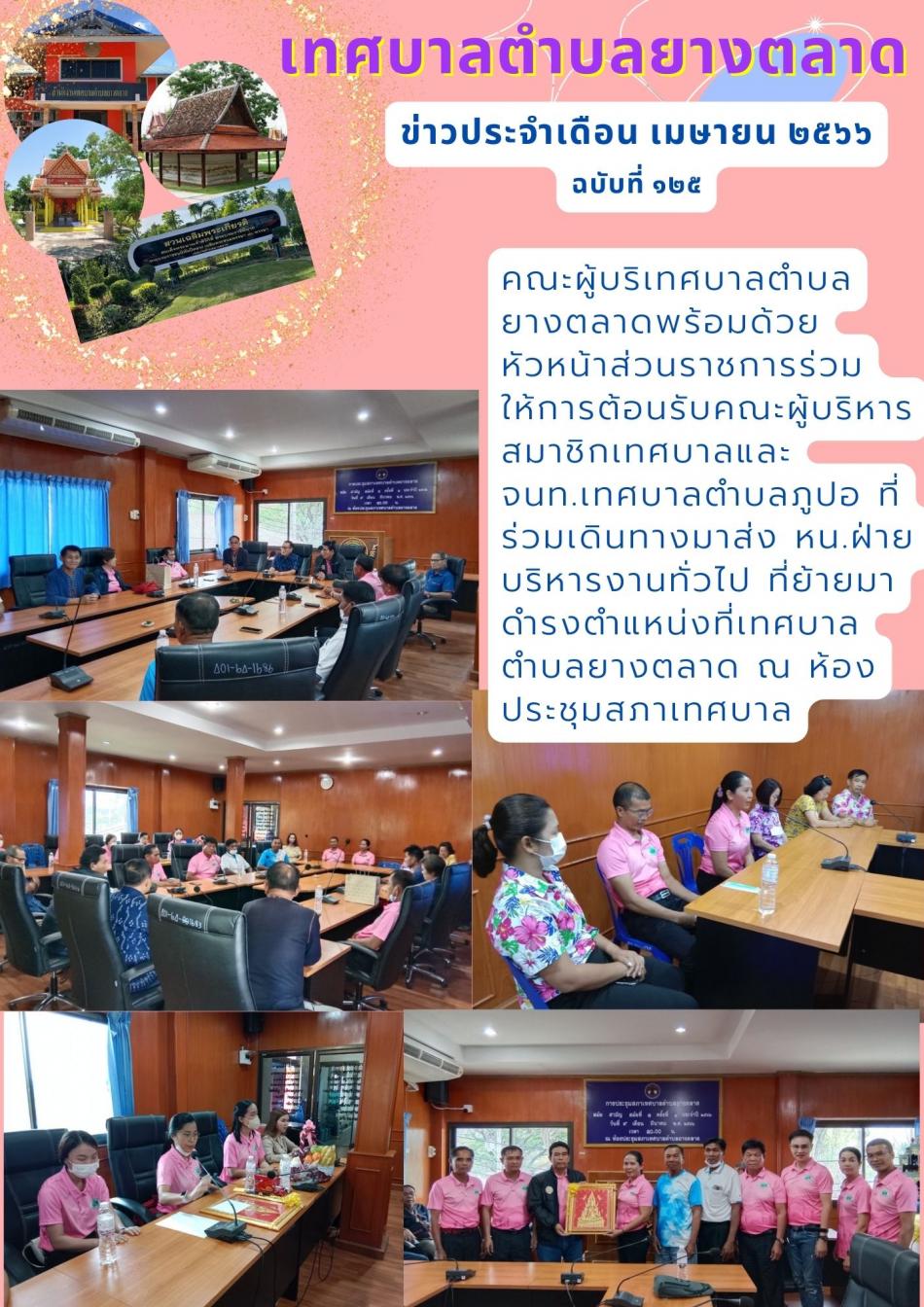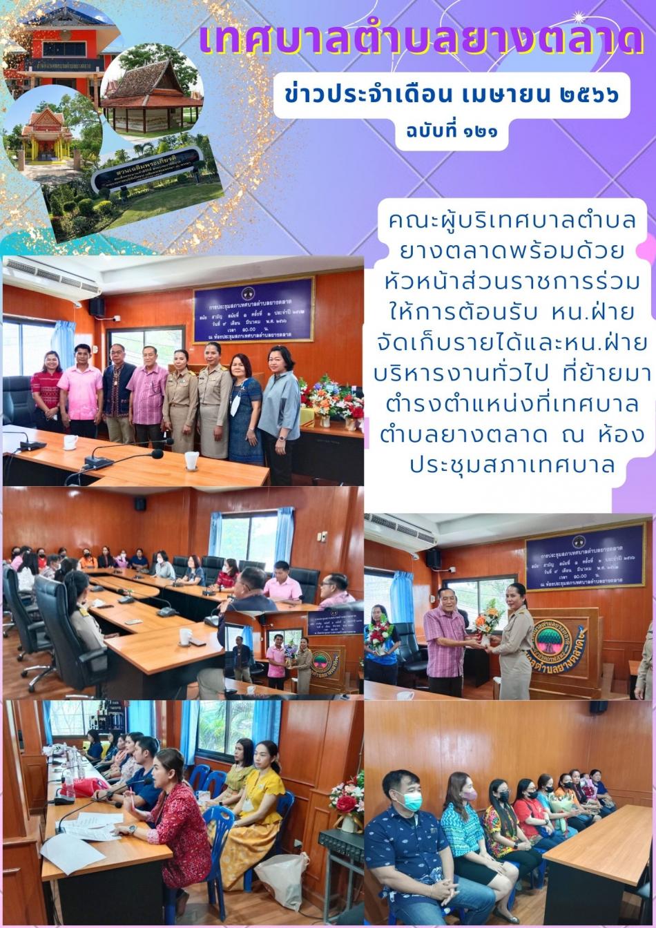 คณะผู้บริเทศบาลตำบลยางตลาดพร้อมด้วย หัวหน้าส่วนราชการร่วมให้การต้อนรับ หน.ฝ่ายจัดเก็บรายได้และหน.ฝ่าย บริหารงานทั่วไป ที่ย้ายมาตำรงตำแหน่งที่เทศบาลตำบลยางตลาด ณ ห้องประชุมสภาเทศบาล [4 เมษายน 2566]
