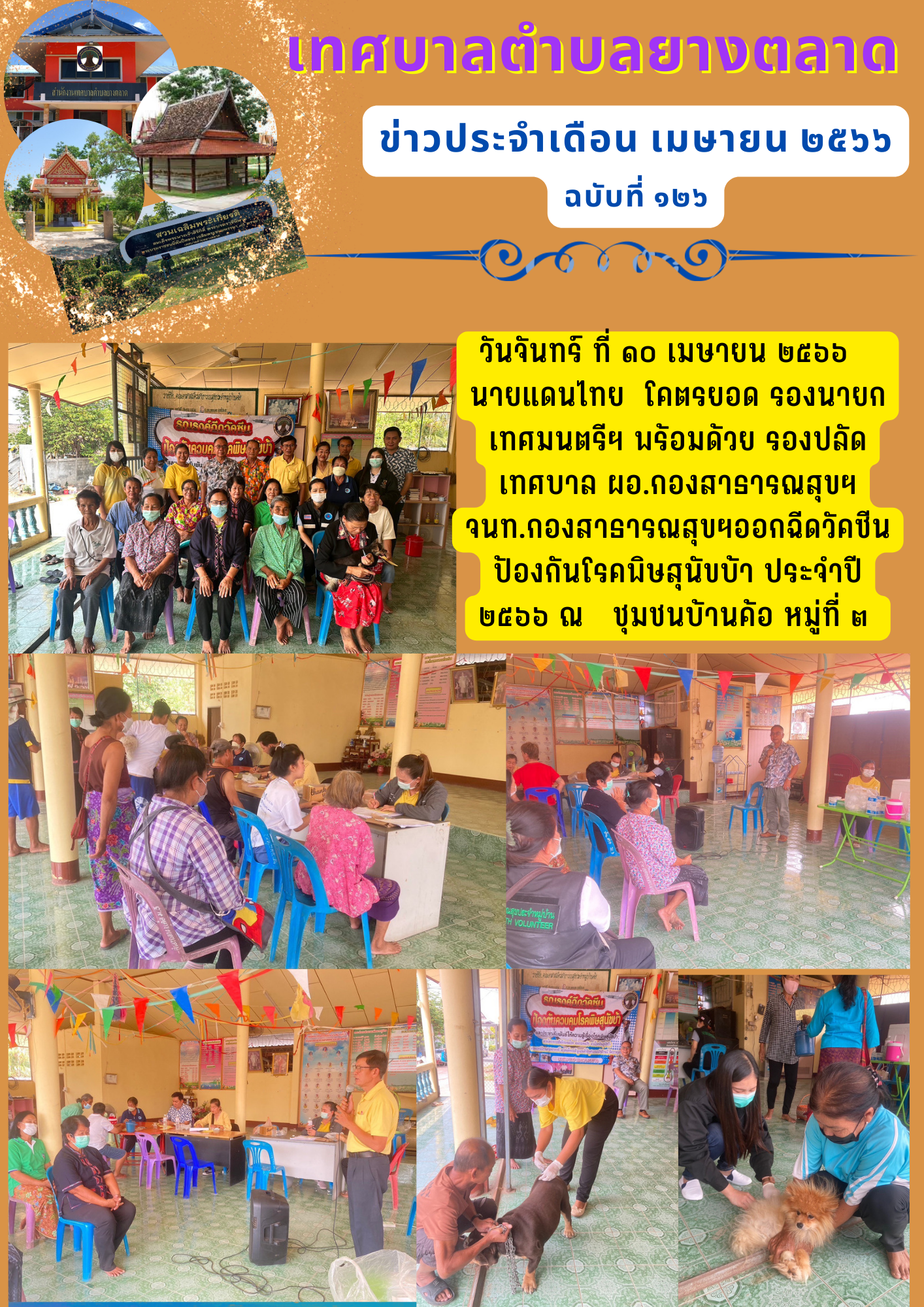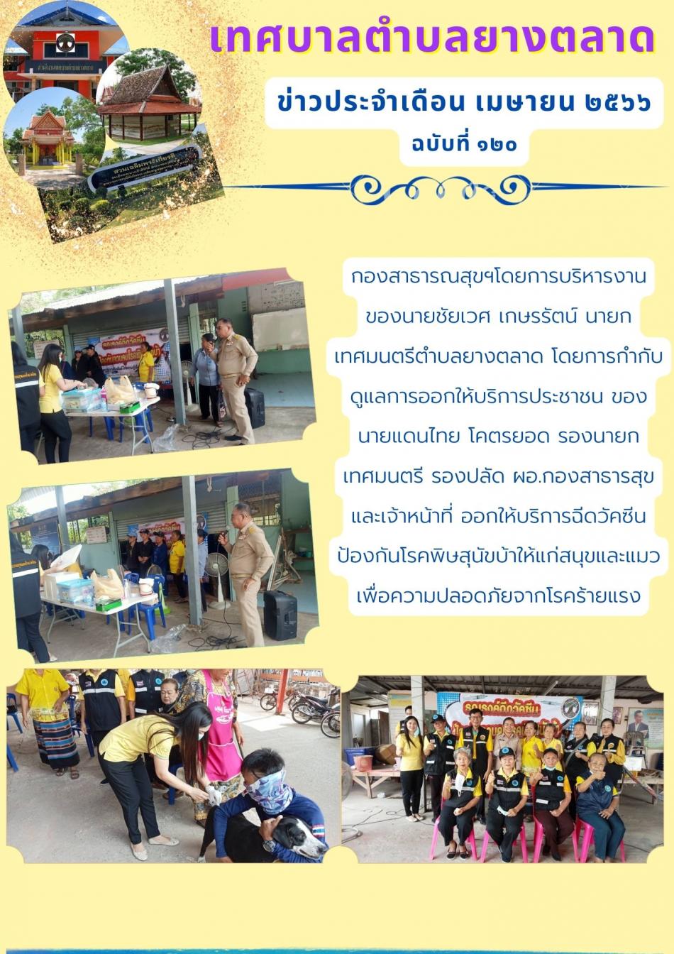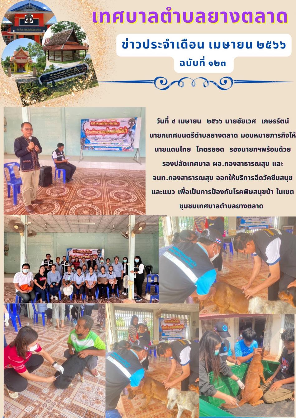 วันที่ ๔ เมษายน ๒๕๖๖ นายชัยเวศ เกษรรัตน์ นายกเทศมนตรีตำบลยางตลาด มอบหมายภารกิจให้นายแดนไทย โคตรยอด รองนายกฯพร้อมด้วย รองปลัดเทศบาล ผอ.กองสาธารณสุข และ จนท.กองสาธารณสุข ออกให้บริการฉีดวัคซีนสนุขและแมว... [4 เมษายน 2566]