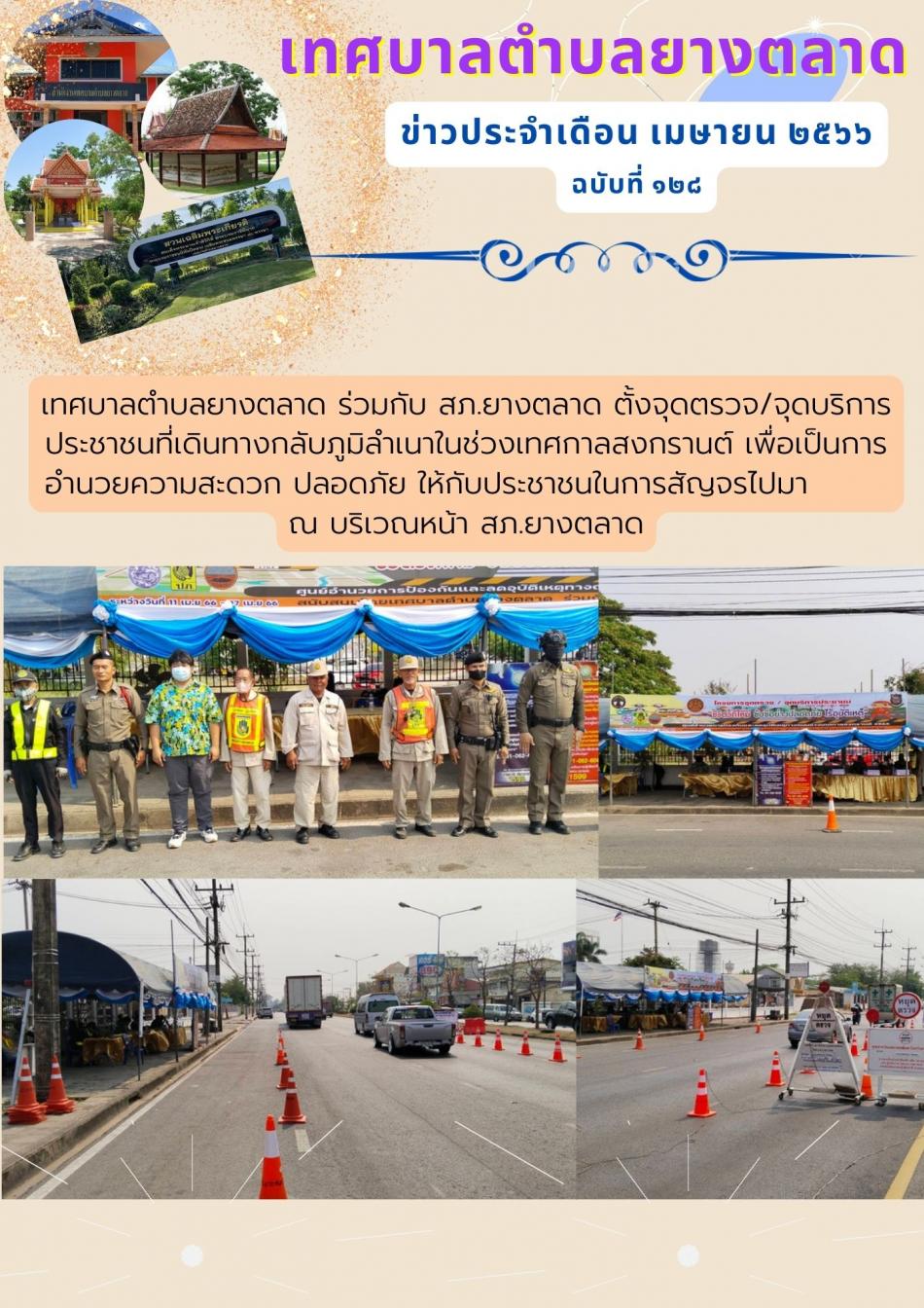 เทศบาลตำบลยางตลาด ร่วมกับ สภ.ยางตลาด ตั้งจุดตรวจ/จุดบริการประชาชนที่เดินทางกลับภูมิลำเนาในช่วงเทศกาลสงกรานต์ เพื่อเป็นการอำนวยความสะดวก ปลอดภัย ให้กับประชาชนในการสัญจรไปมา ณ บริเวณหน้า สภ.ยางตลาด [11 เมษายน 2566]