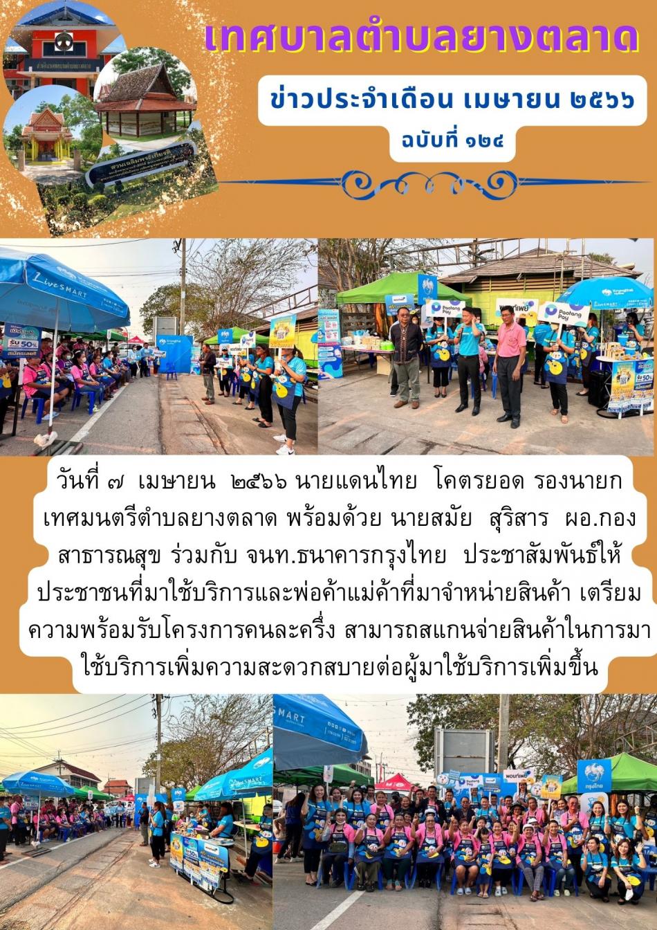 วันที่ ๗ เมษายน ๒๕๖๖ นายแดนไทย โคตรยอด รองนายกเทศมนตรีตำบลยางตลาด พร้อมด้วย นายสมัย สุริสาร ผอ.กองสาธารณสุข ร่วมกับ จนท.ธนาคารกรุงไทย ประชาสัมพันธ์ให้ประชาชนที่มาใช้บริการและพ่อค้าแม่ค้าที่มาจำหน่ายสินค้า... [7 เมษายน 2566]