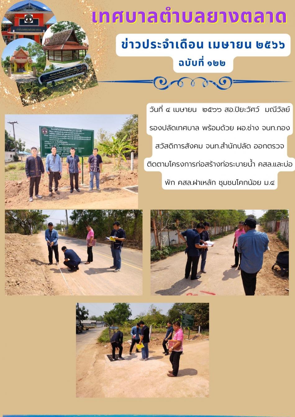 วันที่ ๔ เมษายน ๒๕๖๖ สอ.ปิยะวัศว์ มณีวัลย์ รองปลัดเทศบาล พร้อมด้วย ผอ.ช่าง จนท.กองสวัสดิการ จนท.สำนักปลัด ออกตรวจติดตามโครงการก่อสร้างท่อระบายน้ำ คสล.และบ่อพักคสล.ฝาเหล็ก ชุมชนโคกน้อย ม.๔ [4 เมษายน 2566]