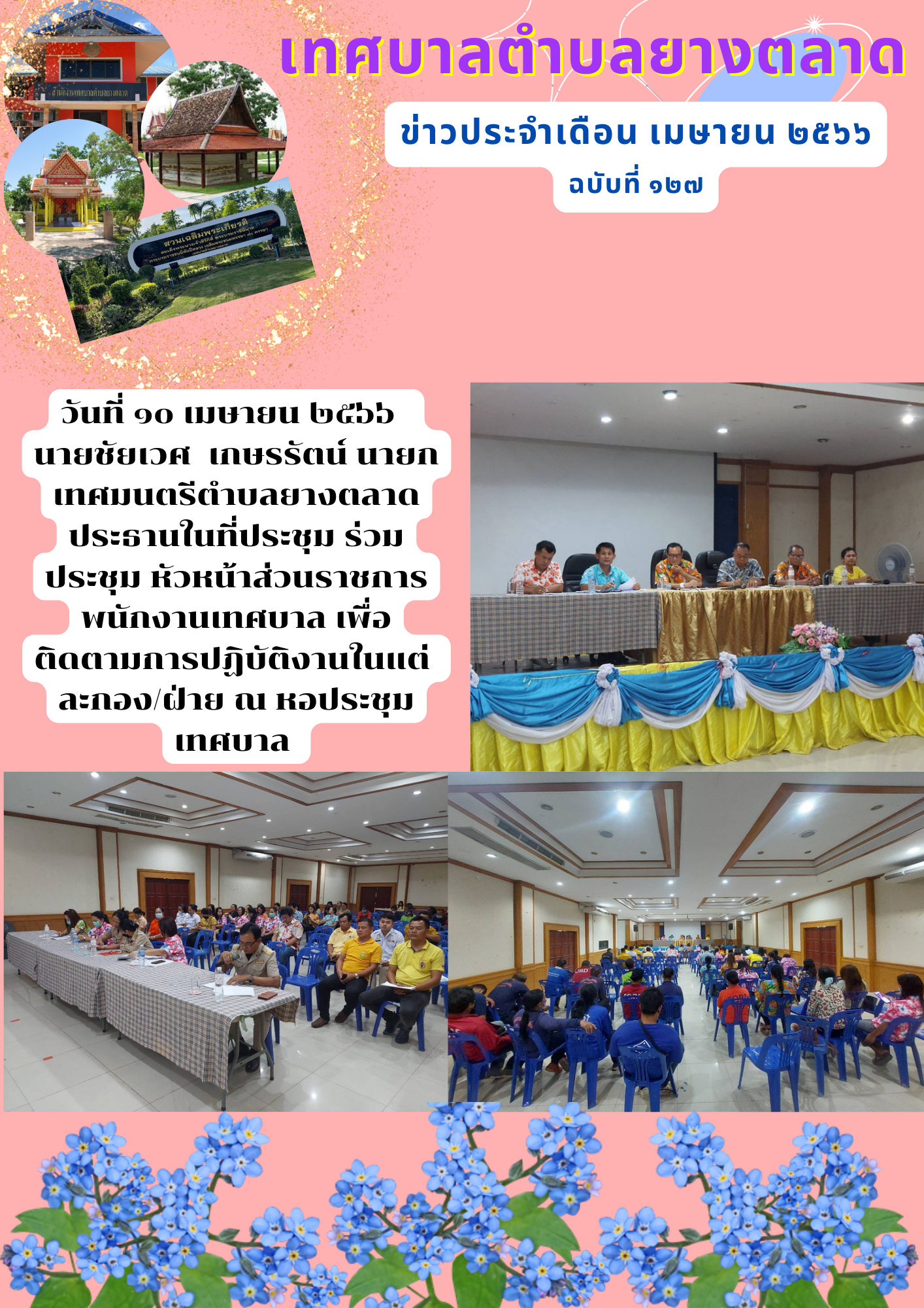 วันที่ ๑๐ เมษายน ๒๕๖๖ นายชัยเวศ เกษรรัตน์ นายกเทศมนตรีตำบลยางตลาด ประธานในที่ประชุม ร่วมประชุม หัวหน้าส่วนราชการ พนักงานเทศบาล เพื่อติดตามการปฏิบัติงานในแต่ ละกอง/ฝ่าย ณ หอประชุมเทศบาล [10 เมษายน 2566]