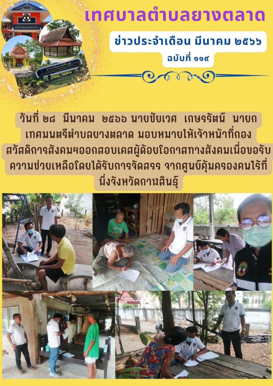 วัันที่ ๒๘ มีนาคม ๒๕๖๖ นายชัยเวศ เกษรรัตน์ นายกเทศมนตรีตำบลยางตลาด มอบหมายให้เจ้าหน้าที่กองสวัสดิการสังคมฯออกสอบเคสผู้ด้อยโอกาสทางสังคมเพื่อขอรับความช่วยเหลือโดยได้รับการจัดสรร... [29 มีนาคม 2566]