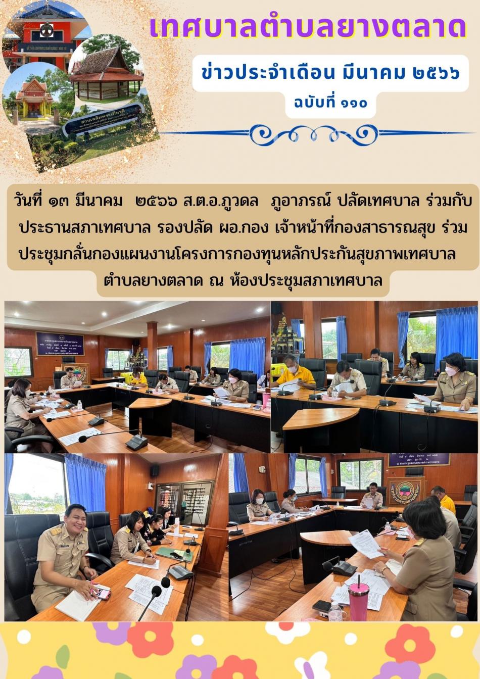 วันที่ ๑๓ มีนาคม ๒๕๖๖ ส.ต.อ.ภูวดล ภูอาภรณ์ ปลัดเทศบาล ร่วมกับ ประธานสภาเทศบาล รองปลัด ผอ.กอง เจ้าหน้าที่กองสาธารณสุข ร่วมประชุมกลั่นกองแผนงานโครงการกองทุนหลักประกันสุขภาพเทศบาล ตำบลยางตลาด ณ ห้องประชุมสภาเทศบาล [13 มีนาคม 2566]