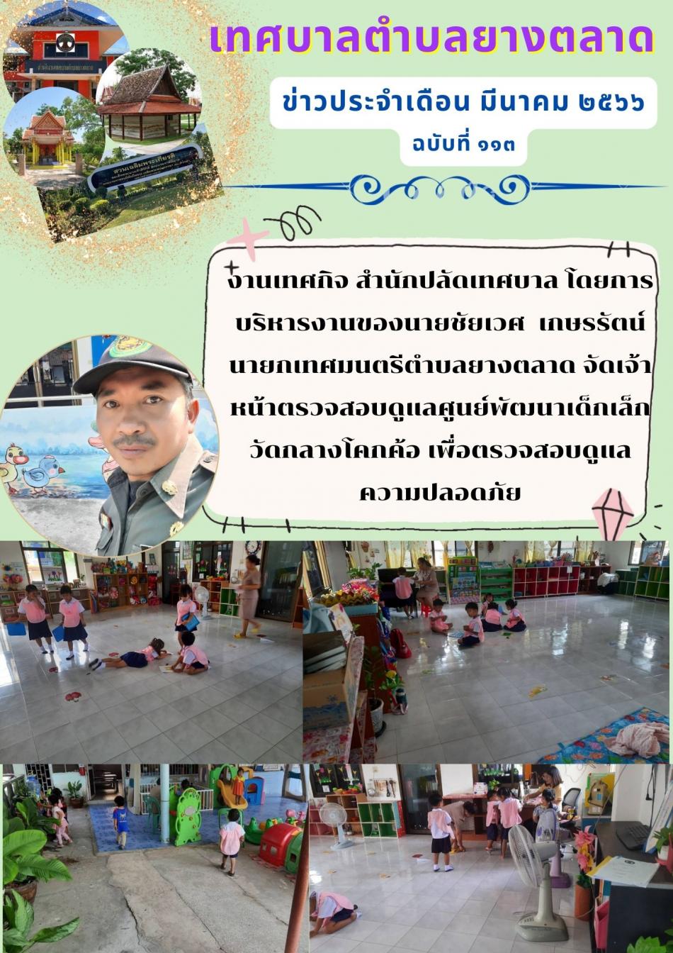 งานเทศกิจ สำนักปลัดเทศบาล โดยการบริหารงานของนายชัยเวศ เกษรรัตน์ นายกเทศมนตรีตำบลยางตลาด จัดเจ้าหน้าตรวจสอบดูแลศูนย์พัฒนาเด็กเล็กวัดกลางโคกค้อ เพื่อตรวจสอบดูแลความปลอดภัย [20 มีนาคม 2566]