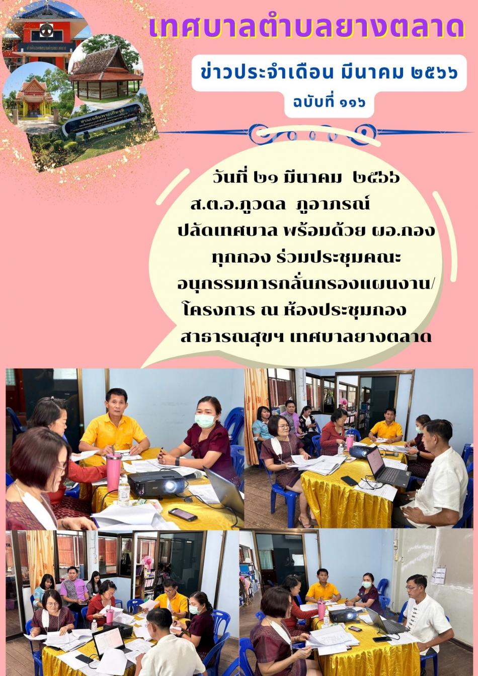 วันที่ ๒๑ มีนาคม ๒๕๖๖ ส.ต.อ.ภูวดล ภูอาภรณ์ ปลัดเทศบาล พร้อมด้วย ผอ.กอง ทุกกอง ร่วมประชุมคณะอนุกรรมการกลั่นกรองแผนงาน/โครงการ ณ ห้องประชุมกอง สาธารณสุขฯ เทศบาลยางตลาด [21 มีนาคม 2566]