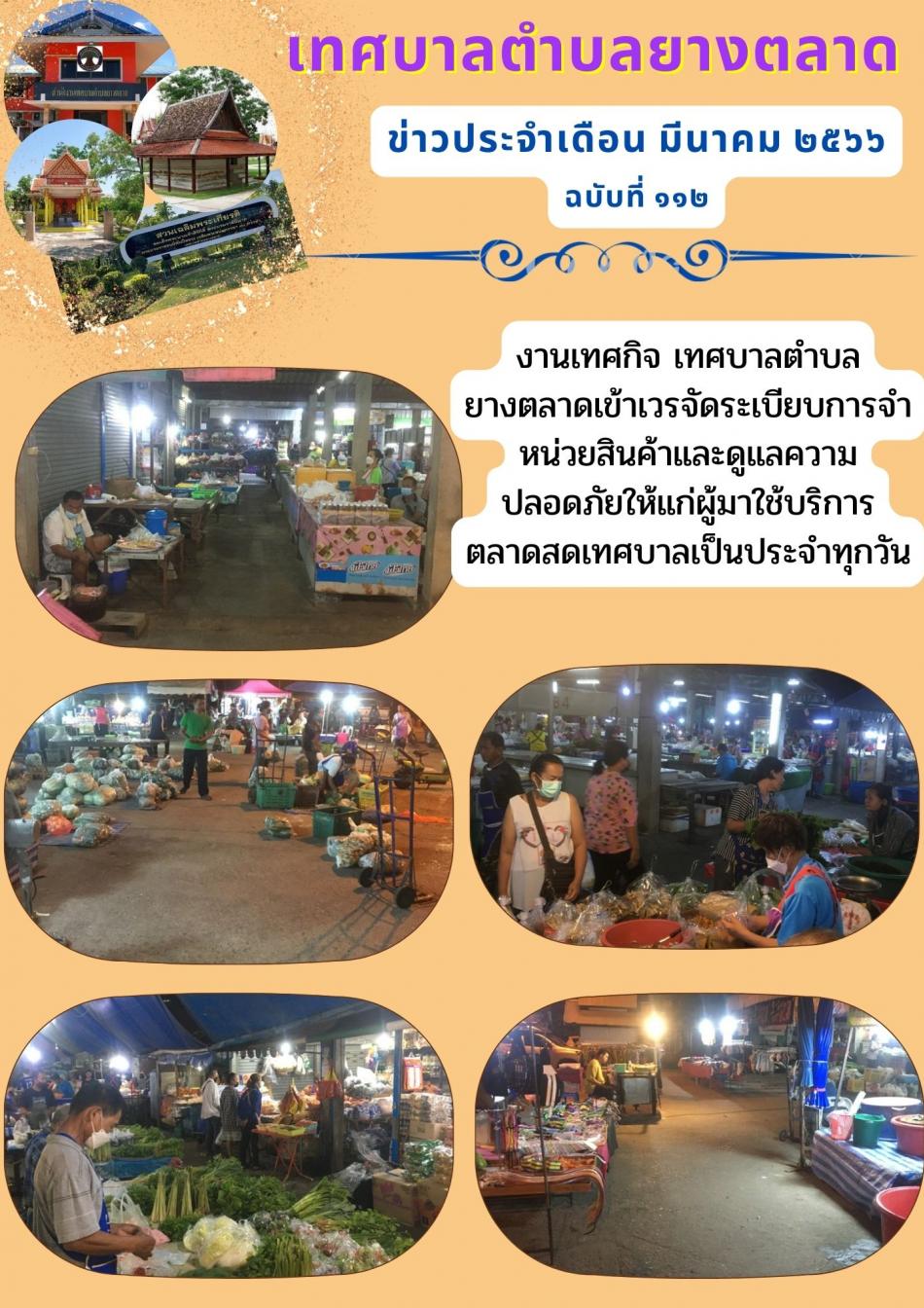 งานเทศกิจ เทศบาลตำบลยางตลาดเข้าเวรจัดระเบียบการจำหน่วยสินค้าและดูแลความปลอดภัยให้แก่ผู้มาใช้บริการตลาดสดเทศบาลเป็นประจำทุกวัน [20 มีนาคม 2566]