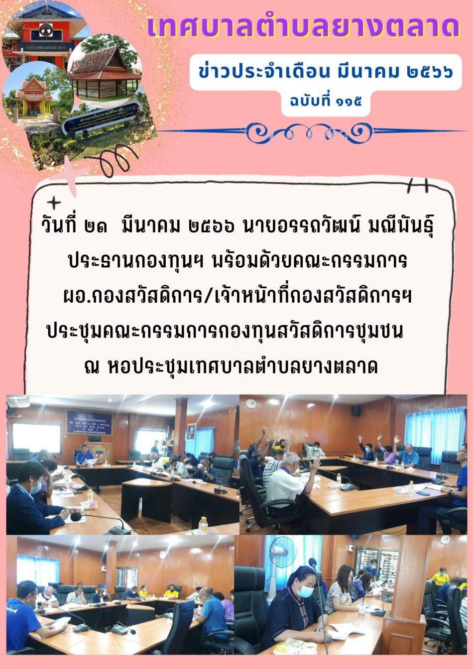 วันที่ ๒๑ มีนาคม ๒๕๖๖ นายอรรถวัฒน์ มณีพันธุ์ ประธานกองทุนฯ พร้อมด้วยคณะกรรมการ ผอ.กองสวัสดิการ/เจ้าหน้าที่กองสวัสดิการฯ ประชุมคณะกรรมการกองทุนสวัสดิการชุมชน ณ หอประชุมเทศบาลตำบลยางตลาด [21 มีนาคม 2566]
