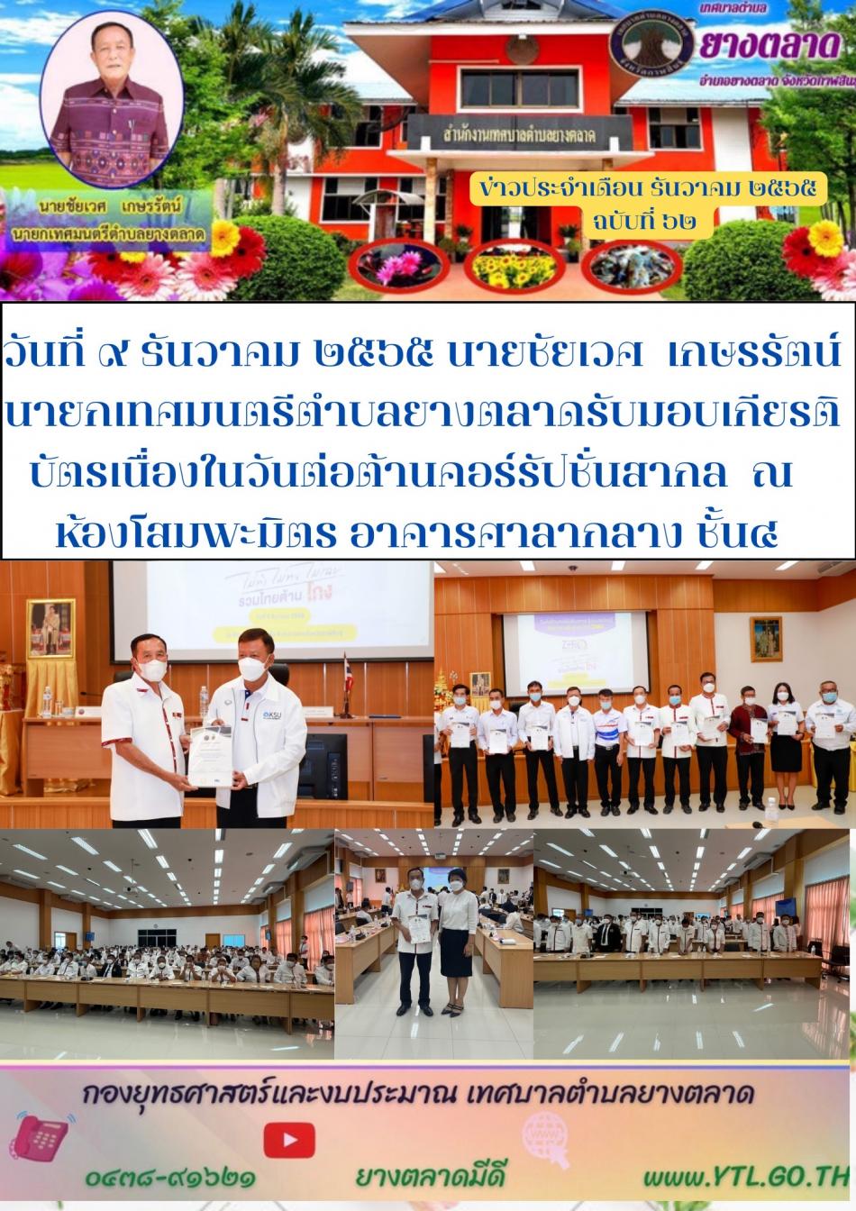 วันที่ ๙ ธันวาคม ๒๕๖๕ นายชัยเวศ เกษรรัตน์ นายกเทศมนตรีตำบลยางตลาดรับมอบเกียรติบัตรเนื่องในวันต่อต้านคอร์รัปชั่นสากล ณ ห้องโสมพะมิตร อาคารศาลากลาง ชั้น๔ [9 ธันวาคม 2565]