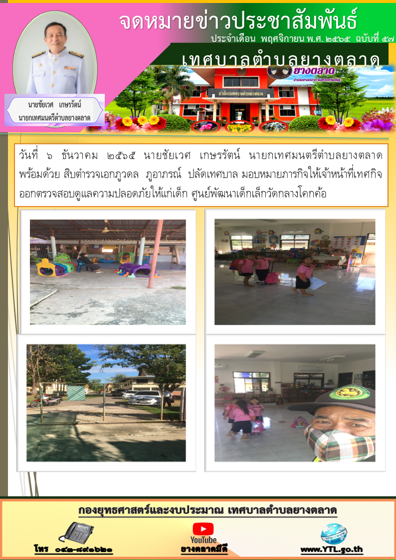 วันที่ ๖ ธันวาคม ๒๕๖๕ นายชัยเวศ เกษรรัตน์ นายกเทศมนตรีตำบลยางตลาด พร้อมด้วย สิบตำรวจเอกภูวดล ภูอาภรณ์ ปลัดเทศบาล มอบหมายภารกิจให้เจ้าหน้าที่เทศกิจออกตรวจสอบดูแลความปลอดภัยให้แก่เด็ก... [6 ธันวาคม 2565]
