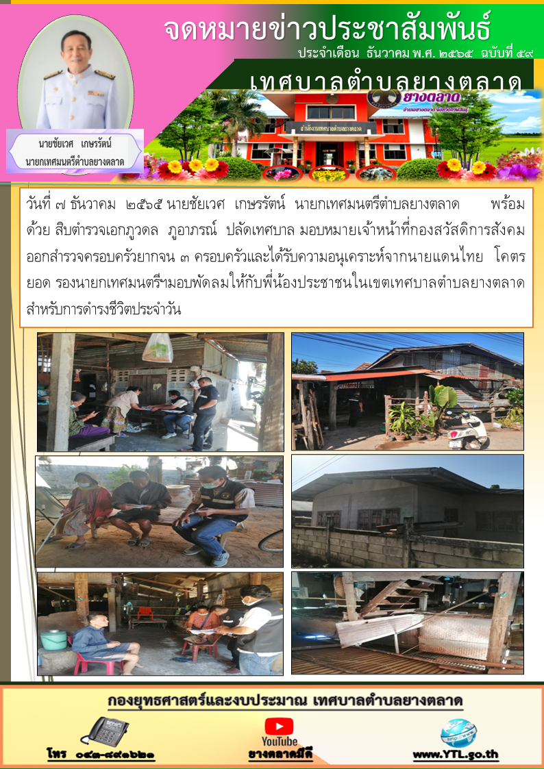 วันที่ ๗ ธันวาคม ๒๕๖๕ นายชยเวศ เกษรรัตน์ นายกเทศมนตรีตำบลยางตลาดพร้อมด้วยสิบตำรวจเอกภูวดล ภูอาภรณ์ ปลัดเทศบาลมอบหมายให้เจ้าหน้าที่กองสวัสดิการสังคมออกสำรวจครอบครัวยากจน ๓... [7 ธันวาคม 2565]