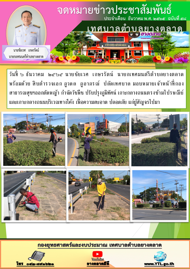 วันที่ ๖ ธันวาคม ๒๕๖๕ นายชัยเวศ เกษรรัตน์ นายกเทศมนตรีตำบลยางตลาด พร้อมด้วย สิบตำรวจเอก ภูวดล ภูอาภรณ์ ปลัดเทศบาล มอบหมายเจ้าหน้าที่กองสาธารณสุขฯออกตัดหญ้า กำจัดวัชพืช ปรับปรุงภูมิทัศน์... [6 ธันวาคม 2565]