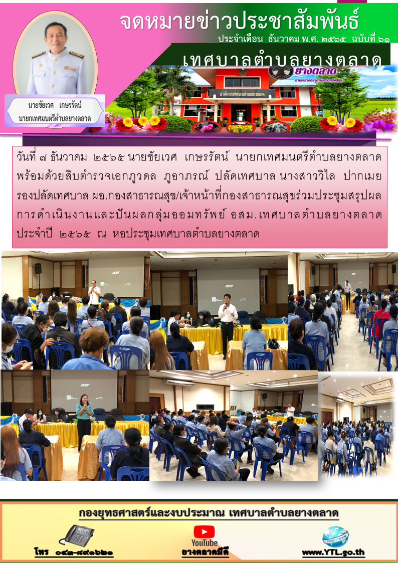 วันที่ ๗ ธันวาคม ๒๕๖๕ นายชัยเวศ เกษรรัตน์ นายกเทศมนตรีตำบลยางตลาด พร้อมด้วยสิบตำรวจเอกภูวดล ภูอาภรณ์ ปลัดเทศบาล นางสาววิไล ปากเมย รองปลัดเทศบาล... [7 ธันวาคม 2565]