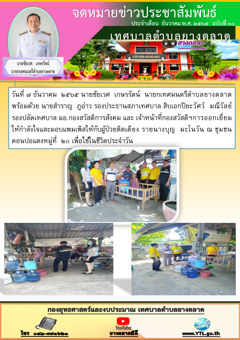 วันที่ ๗ ธันวาคม ๒๕๖๕ นายชัยเวศ เกษรรัตน์ นายกเทศมนตรีตำบลยางตลาด พร้อมด้วย นายสำราญ ภูอ่าว รองประธานสภาเทศบาล สิบเอกปิยะวัศว์ มณีวัลย์ รองปลัดเทศบาล ผอ.กองสวัสดิการสังคม และ... [7 ธันวาคม 2565]