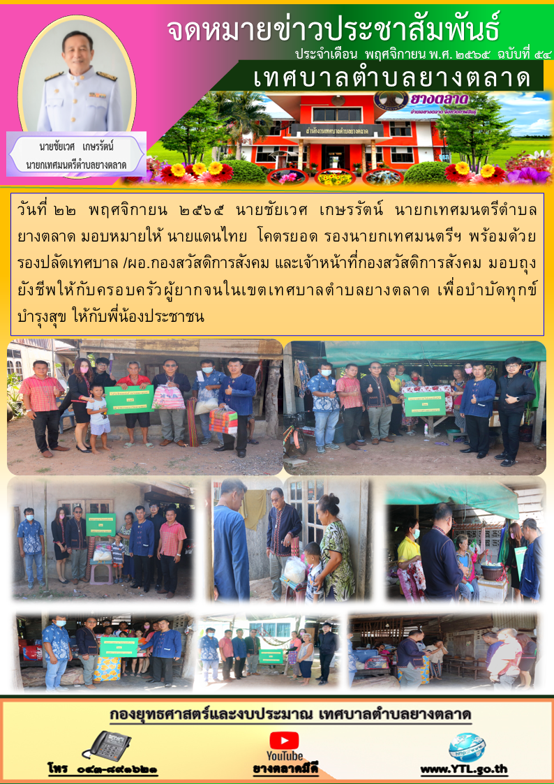 วันที่ ๒๒ พฤศจิกายน ๒๕๖๕ นายชัยเวศ เกษรรัตน์ นายกเทศมนตรีตำบล ยางตลาด มอบหมายให้ นายแดนไทย โคตรยอด รองนายกเทศมนตรีฯ พร้อมด้วย รองปลัดเทศบาล /ผอ.กองสวัสดิการสังคม และเจ้าหน้าที่กองสวัสดิการสังคม... [22 พฤศจิกายน 2565]