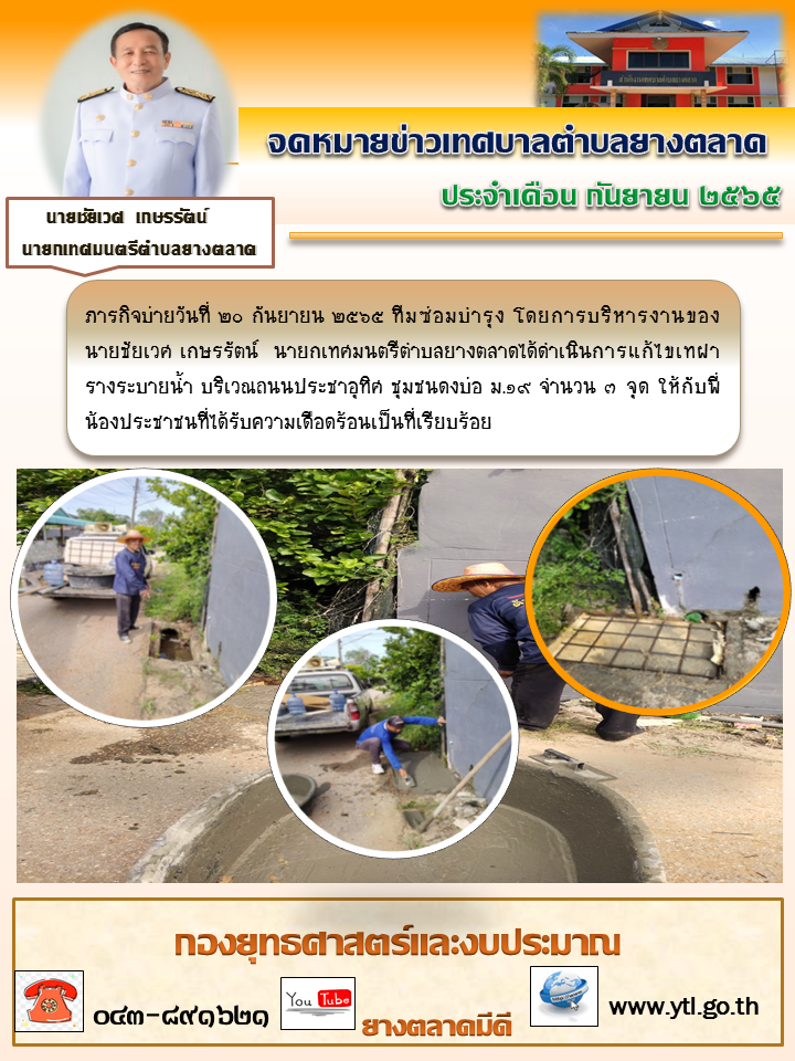 ภารกิจบ่ายวันที่ ๒๐ กันยายน ๒๕๖๕ ทีมซ่อมบำรุง โดยการบริหารงานของ นายชัยเวศ เกษรรัตน์ นายกเทศมนตรีตำบลยางตลาดได้ดำเนินการแก้ไขเทฝารางระบายน้ำ บริเวณถนนประชาอุทิศ ชุมชนดงบ่อ ม.๑๙ จำนวน ๓ จุด... [20 กันยายน 2565]